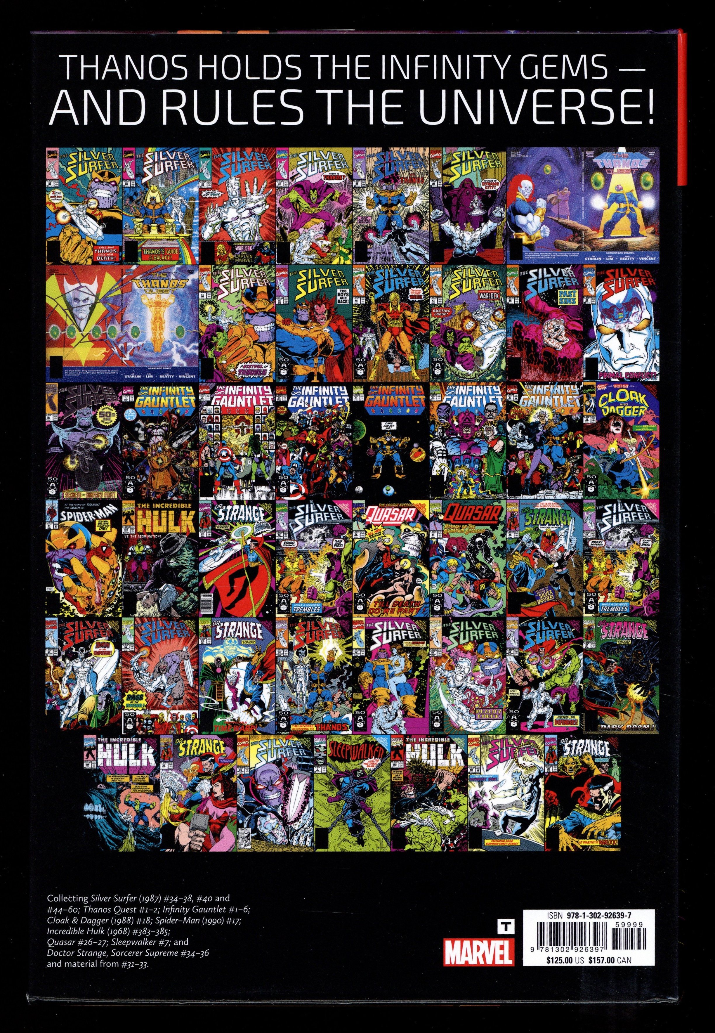 1st Edition - 1st printing. Collects Silver Surfer (1987-1998 2nd Series) #34-38, 40 and 44-60, Thanos Quest (1990) #1-2, Infinity Gauntlet (1991) #1-6, Cloak and Dagger (1988-1991 Marvel 3rd Series) #18, Spider-Man (1990-1998) #17, Incredible Hulk (1962-1999 1st Series) #383-385, Doctor Strange (1988-1996 3rd Series) #31-36, Quasar (1989-1994) #26-27 and Sleepwalker (1991-1994) #7.
