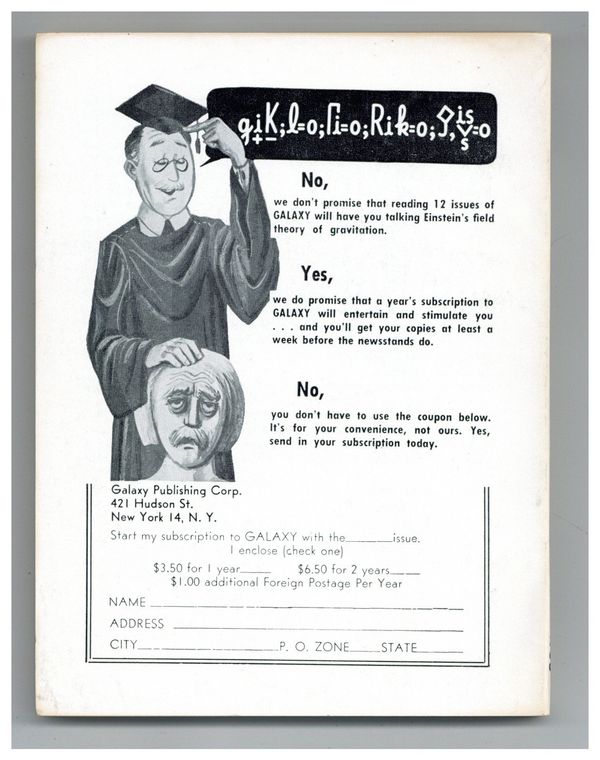 Published Nov 1958 by Galaxy Publications.$18.00November 1958. Cover by Paul Wenzel. Stories: "The Civilization Game" by Clifford D. Simak, "Birds of A Feather" by Robert Silverberg, "People Soup" by Alan Arkin, "No Substitutions" by Jim Harmon, "Time Killer" (Part 2 of 4) by Robert Sheckley. Illustrations by Dick Francis & Wallace Wood. Softcover Pulp Digest, 5-in. x 7-in.; 144 Pages, B&W. Cover price $0.35.