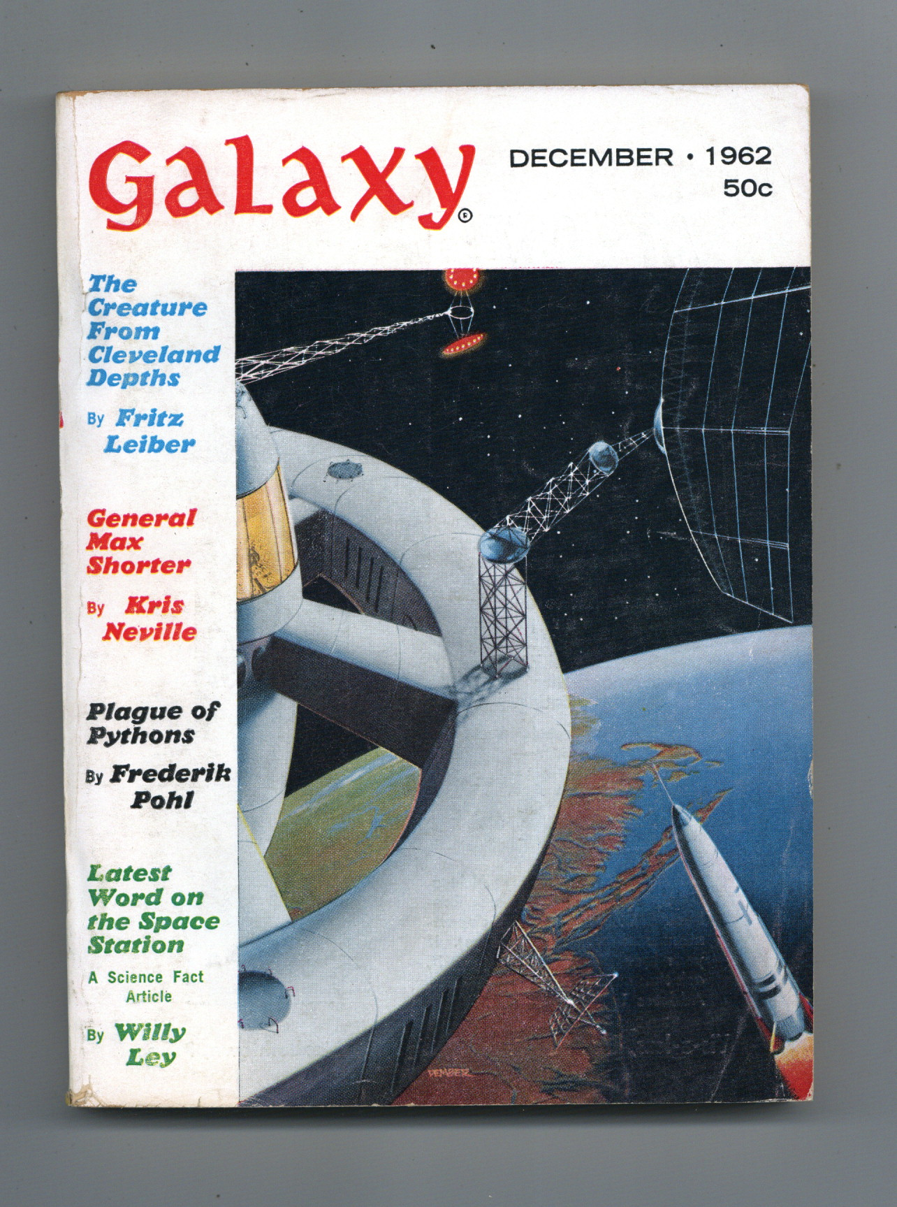 Published Dec 1962 by Galaxy Publications.$9.70December 1962. Cover by Sol Dember. Stories: "The Creature From Cleveland Depths" by Fritz Leiber, "General Max Shorter" by Kris Neville, "Dr. Morris Goldpepper Returns" by Avram Davidson, "Droozle" by Frank Banta, "Sodom & Gomorrah, Texas" by R.A. Lafferty, "The Glory of Ippling" by Helen M. Urban, and "Plague of Pythons" (Part 2 of 2) by Frederik Pohl. Article: "Pluto - Doorway to the Stars" by George Peterson Field. Illustrations by Wallace Wood, Jack Gaughan, and Bob Ritter. Softcover Pulp Digest, 5-in. x 7-in.; 194 Pages, B&W. Cover price $0.50.