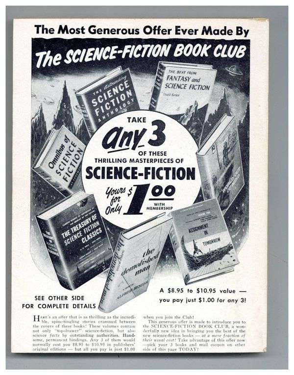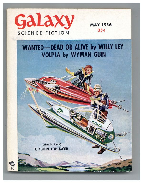 Published May 1956 by Galaxy Publications.$12.00May 1956. Cover by Tocchet. Stories: "Volpla" by Wyman Guin, "A Coffin For Jacob" by Edward W. Ludwig, "Name Your Symptom" by Jim Harmon, "One Across" by Arthur Sellings, and "Slave Ship" (Conclusion) by Frederik Pohl. Illustrations by Dick Francis, Ed Emshwiller (Emsh), and Cal. Softcover Pulp Digest, 5-in. x 7-in.; 194 Pages, B&W. Cover price $0.35.
