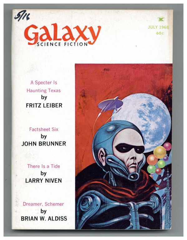 Published Jul 1968 by Galaxy Publications.$5.49July 1968. Cover by jack Gaughan. Stories: "There Is A Tide" by Larry Niven, "Factsheet Six" by John Brunner, "A Specter is Haunting Texas" (Part 1 of 3) by Fritz Leiber, "McGruder's Marvels" by R.A. Lafferty, "Bailey's Ark" by Burt K. Filer, "Dreamer, Schemer" by Brian W. Aldiss, "Seconds' Chance" by Robin Scott, and "When I Was In The Zoo" by A. Bertram Chandler. Illustrations by Jack Gaughan, Joe Wehrle Jr., Jeff Jones, Brock, and Brand. Softcover Pulp Digest, 5-in. x 7-in.;194 Pages, B&W. Cover price $0.50.