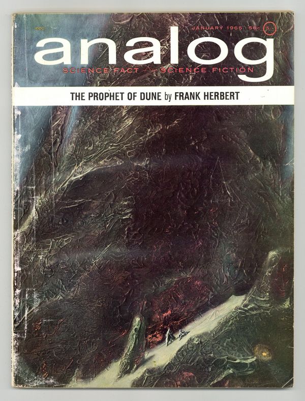 January 1965. Science Fact: "It's Done With Mirrors" by William F. Dawson and Ben Bova. Novelette: "A Matter Of Timing" by Hank Dempsey. Serial: "The Prophet of Dune" by Frank Herbert. Plus several more stories. Cover art by John Schoenherr, Illustrations by Kelly Freas. 8.25" x 11", 96 pages, B&W. Cover price $0.50.