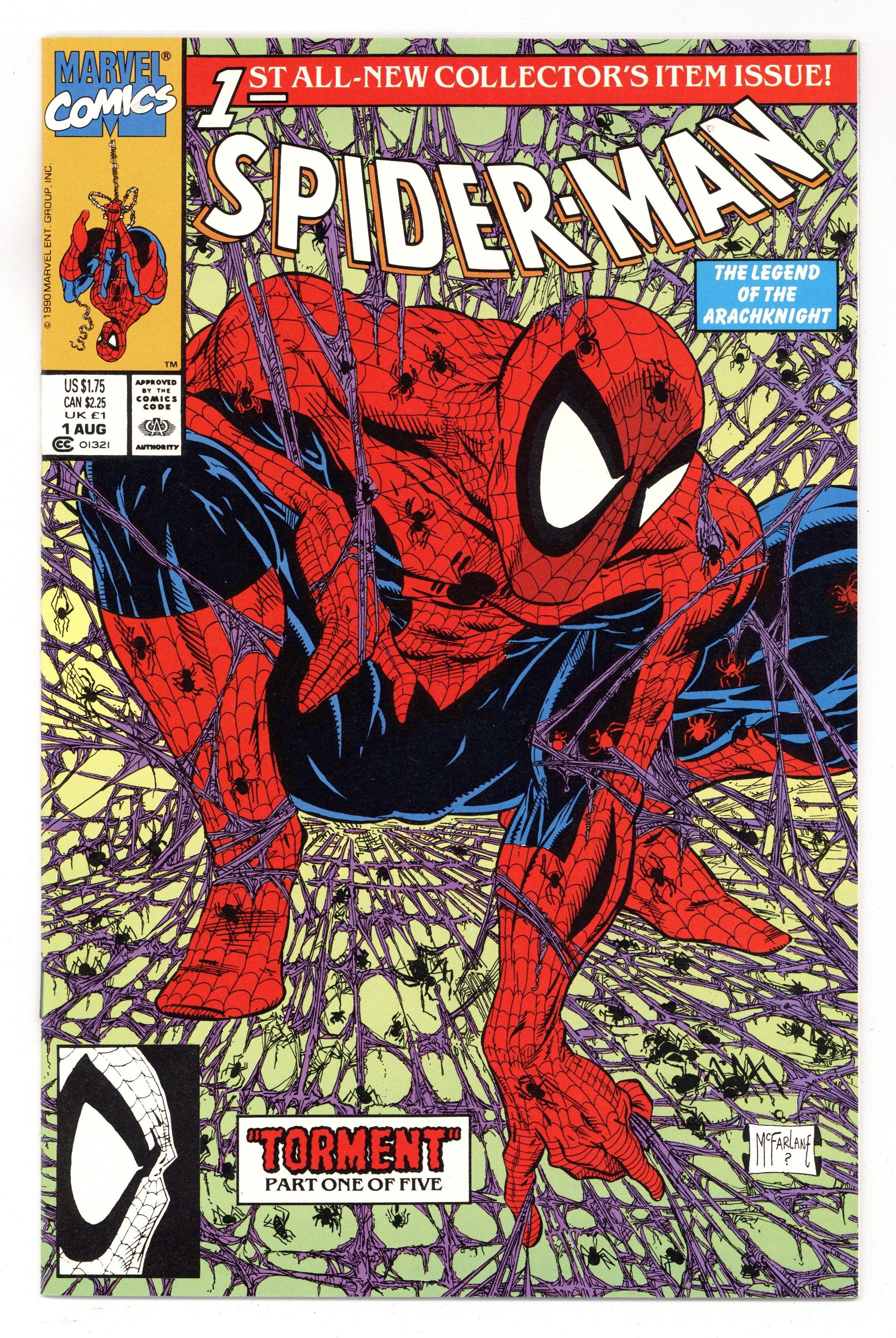 Unbagged Direct Edition - Torment Part 1 of 5. "Torment" Script and art by Todd McFarlane. Cover by Todd McFarlane. Fresh off his legendary run on the Amazing Spider-Man series, superstar artist Todd McFarlane takes the reins of his own Spider-title! Right off the bat the breathtaking action begins as mysterious and ominous drums awaken the Lethal Lizard! And send the reptilian creature on a path of death and destruction thru New York City! Spider-Man's nightmare is just starting! Appearance by Mary Jane Watson. (Notes: Spider-Man #1 was one of the first Marvel issues to feature numerous variant covers. The Spider-Man (1990) series became the fourth monthly title for the web-slinger. This issue was published the same month as Amazing Spider-Man 337. The letters page features an essay by Todd McFarlane. The webbing on the cover may be gray or purple.) 32 pages. Cover price $1.75.