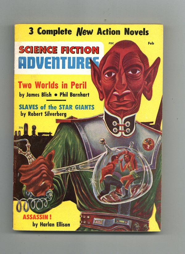 Tags: Pulp AdventurePublished Feb 1957 by Royal Publications.$58.00February 1957. Volume 1, Issue 2. Cover by William Bowman. "Assassin!" by Harlan Ellison, "Two Worlds in Peril" by James Blish & Phil Barnett, & "Slaves of the Star Giants" by Robert Silverberg. Interior illustrations by Bowman & Stallman. Softcover pulp digest; 5.25-in. x 7.5-in., 130 pages, B&W. Cover price $0.35.