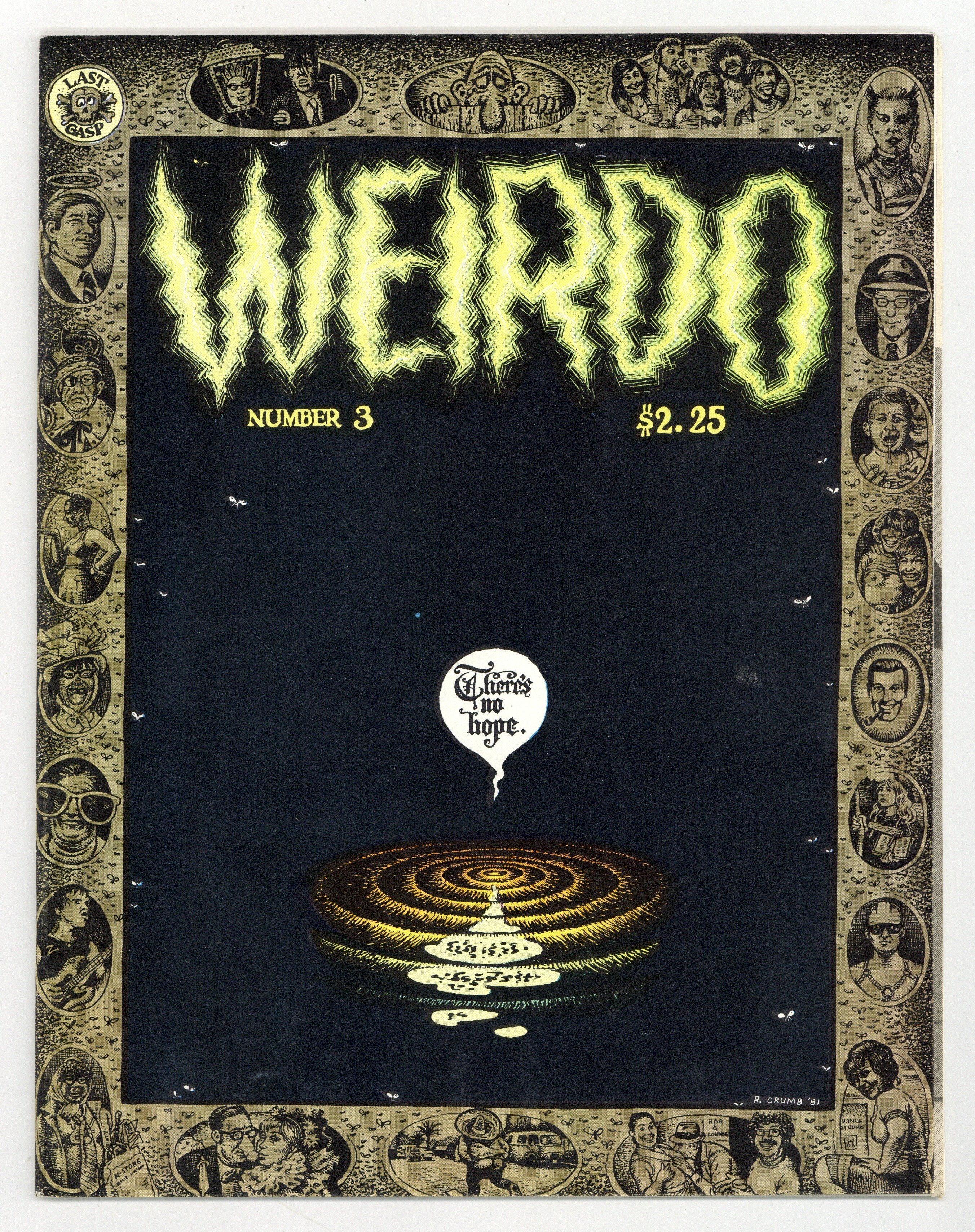 1st printing. Cover by Robert Crumb. "Troubles With Gassel," script by Terry Zwigoff, art by Bob Armstrong; Morrie is caught short needing a dump. "The Adventures Of Onion Head," script and art by Robert Crumb; Onion Head leaves the farm for the wider world. Twenty-one drawings produced by Max Crumb. "My Pet Penis," script and art by Terry Boyce; A girl discovers a pet penis. "The Bean Sisters Get In Shape," script by Robert Crumb, art by "Stomp" Ganos; The Bean Sisters visit Bob's Dancercise Studio. "Excerpts from Boswell's London Journal 1762-1763," script by James Boswell and Robert Crumb, art by Robert Crumb; Boswell carouses and discusses literature in London. "The Adventures of Skank, Arms & Bud!", script by John Holstrom, Peter Bagge, and J.D. King, art by J.D. King; Skank, Arms & Bud have a night out. Twenty-four assorted cartoons with a jazz theme by Gene Deitch. Assorted one-page strips by Robert Crumb. 44 pgs., B&W. 8-in. x 11-in. $2.25. Cover price $2.25.