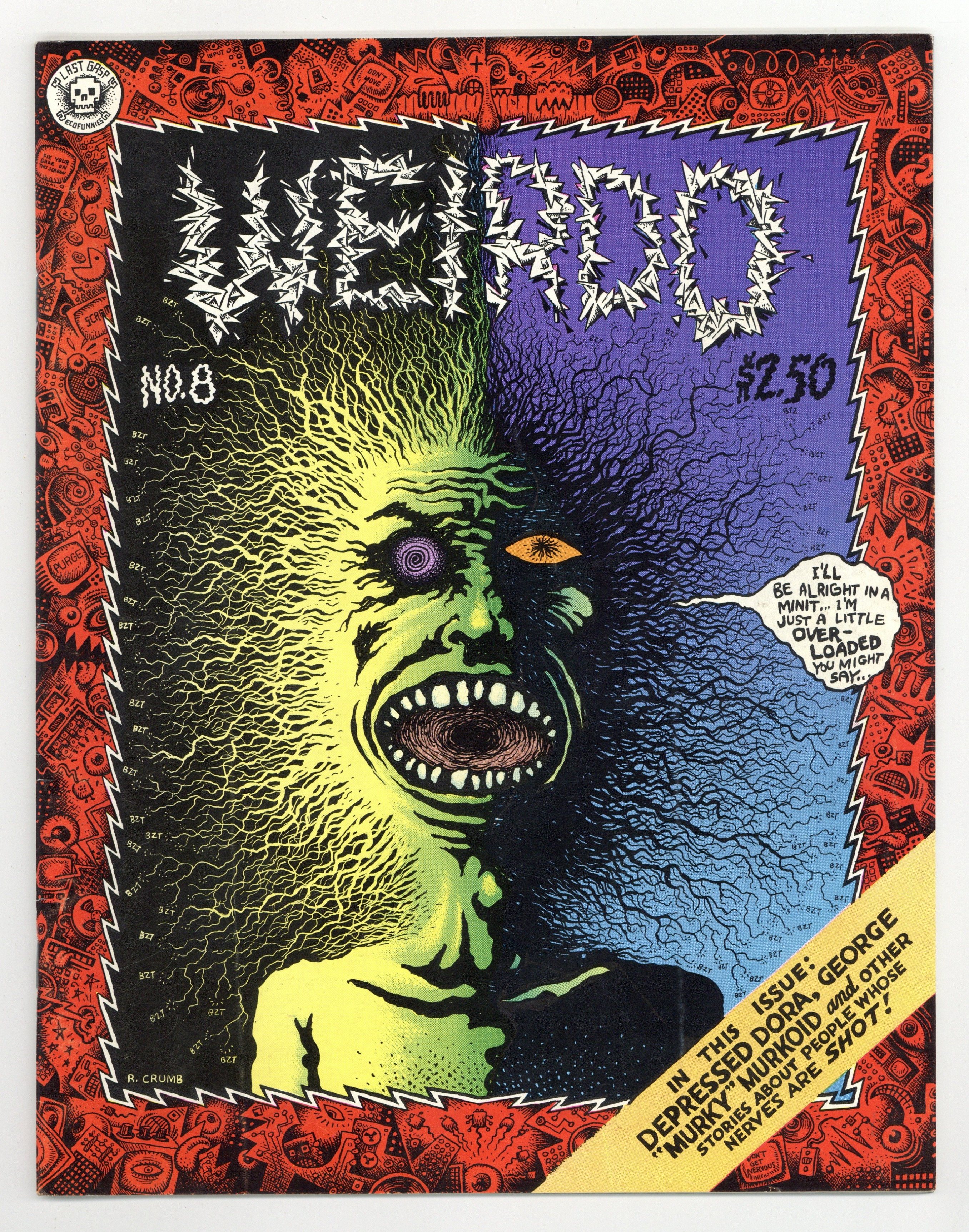 Cover by Robert Crumb. Several one-page strips by David Carrino and Peter Bagge. "The Axeman," script and art by Tom Bertino; An axe murderer in 1920s Louisiana. Several one-page strips by Jeff John. Girls "Turned Into Vibrator Zombies!", script by Dori Seda and Robert Crumb, art by Terry Zwigoff; Sylvia and Bettie go to the vibrator shop. "The Love-Life of an Artist...", script and art by Dori Seda; Dori breaks up her engagement. "The Adventures of George "Murky" Murkoid," script and art by Robert Crumb; George remembers first meeting Gloria. "Life in the Night," script and art by Elinore Norflus; Dora's car breaks down. 44 pgs., B&W. 8-in. x 11-in. $2.50. Cover price $2.50.
