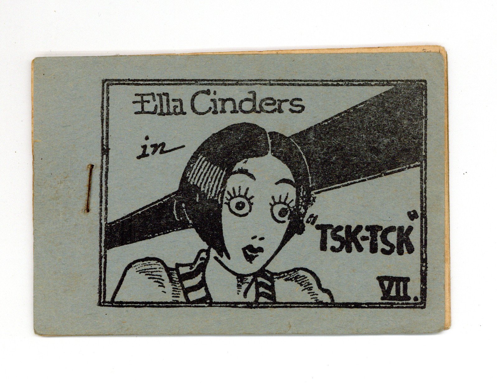 "Ella Cinders in Tsk-Tsk" - This item is an 8-Pager, commonly known as a Tijuana Bible; most were published ca. 1920s-1940s. The artists, writers, and publishers of these booklets are generally unknown. Most 8-Pagers are humorous takes on newspaper comic strip characters, movie stars, and political figures of the time, usually in sexually explicit situations, and invariably produced without permission or respect for copyright. These are timeless pieces of American comic sub-culture and are often considered the precursor to the underground comics created by the likes of Robert Crumb and Gilbert Shelton. Due to the circumstances in which these items were originally created, it is virtually impossible to determine edition and printing, although modern era reprints are usually easily identifiable. We will note these differences to the best of our ability. Not available for international sale. You must be 18 or older to order this item. Loose pages stapled, 4-in. x 3-in., 8 pages, single ink color.