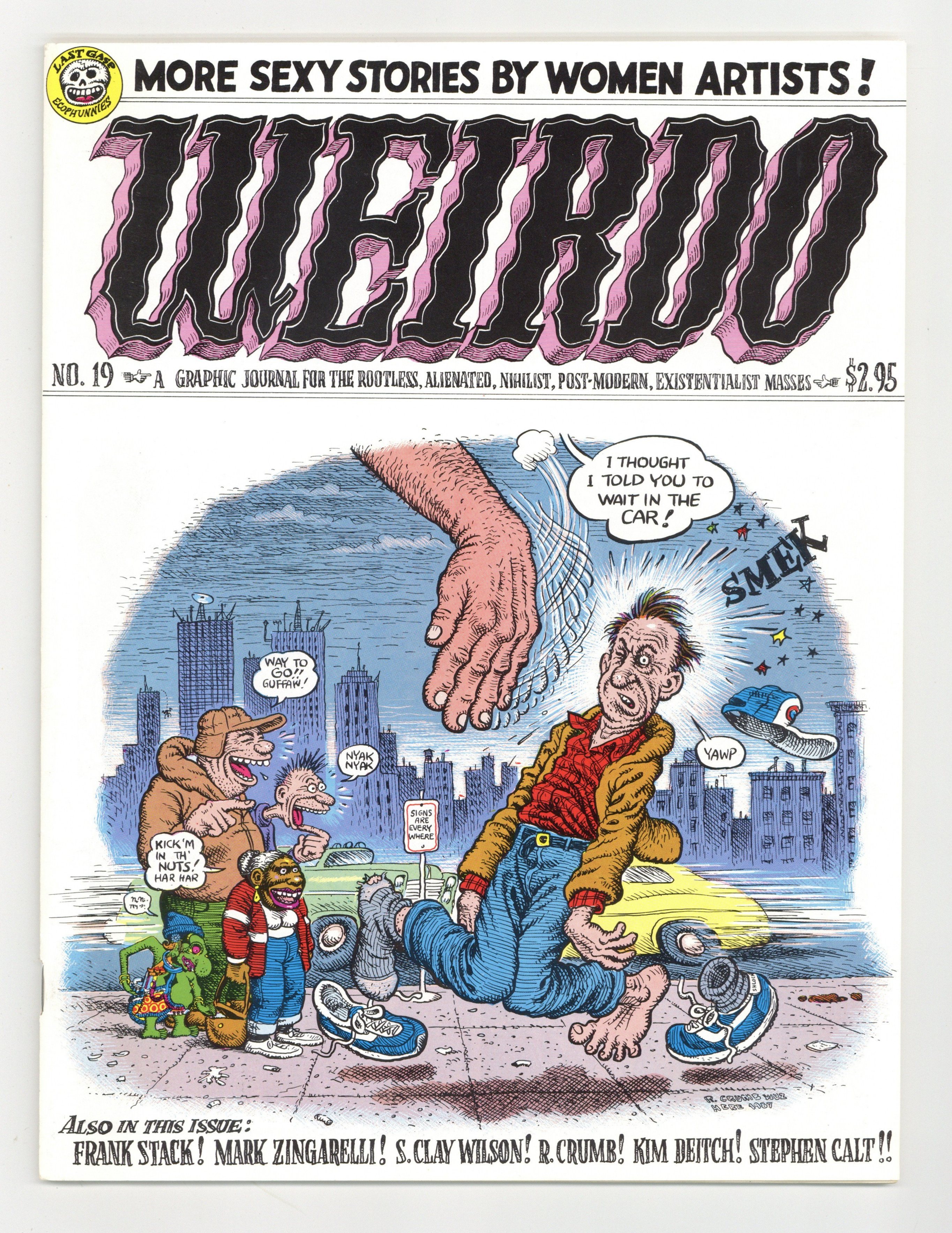 First $2.95 cover price. Cover by Robert Crumb. "The Sufferin' Bastard," script and art by Peter Bagge; The unlucky life of a punch cup. Debut column by Harvey Pekar praising the work of Frank Stack. "Thinking About the Lone Ranger," script and art by Frank Stack (as Foolbert Sturgeon); Musings on the Lone Ranger's possible fallibility. "Ten Dollars for Two Minutes," script and art by Penny Moran Van Horn; A seedy landlord comes a cropper. "Mother Hulda," script and art by Robert Crumb; A young girl receives her just reward and so does her stepsister. "The Talker," script and art by Mark Zingarelli; The thug in the restaurant is unnerved by the man who talks to himself. "Dennis the Sullen Menace," script by Dennis Eichhorn, art by Michael Dougan; Dennis recalls his time in jail. "Young Ledicker," script and art by Kim Deitch; Kewpie views an incident from Al's youth. "The Tunnel of Love" text story, script by Stephen Calt, art by Robert Crumb. "Sex Crazed Housewife," script and art by Aline Kominsky-Crumb. 44 pgs., B&W. 8-in. x 11-in. $2.95. Cover price $2.95.