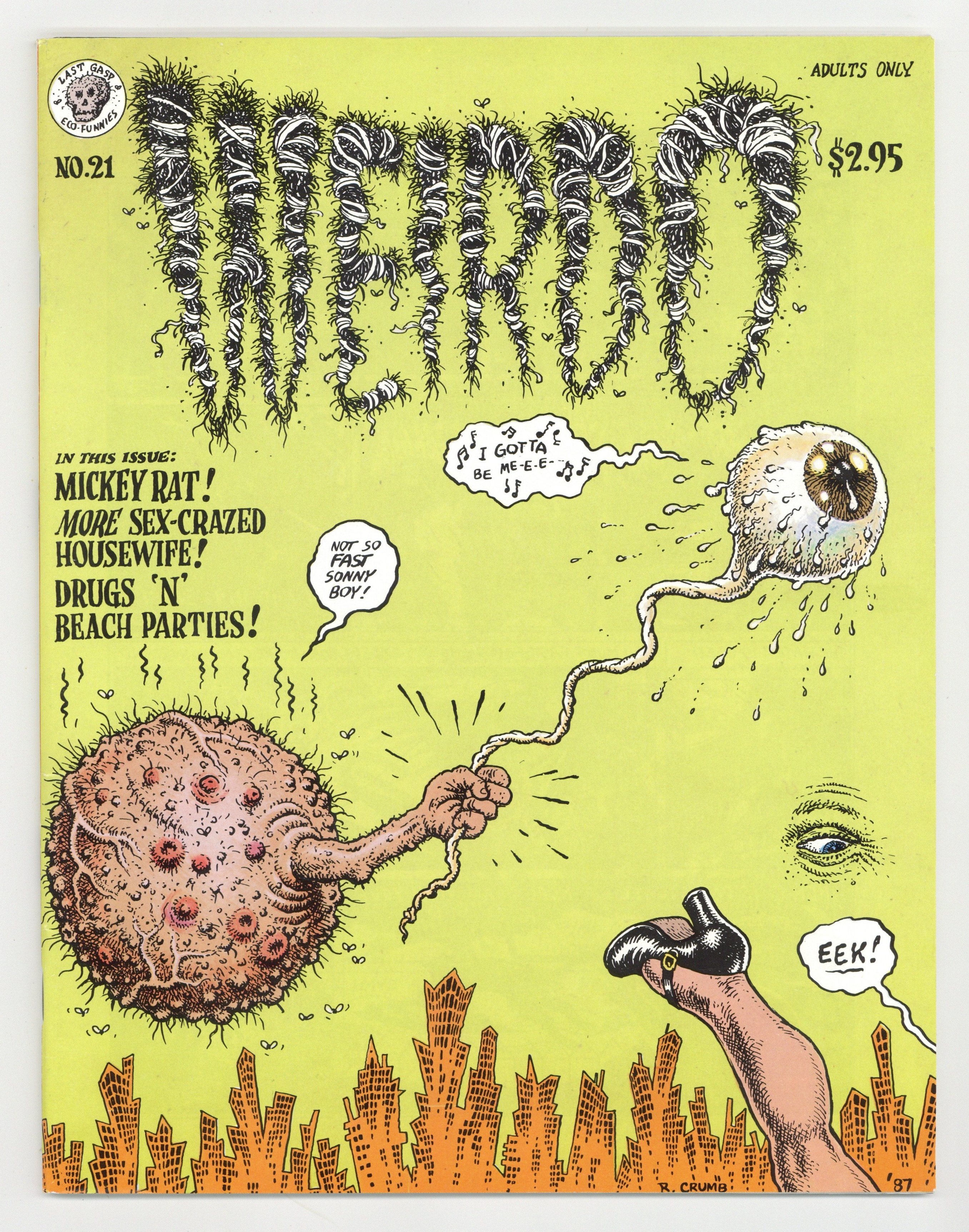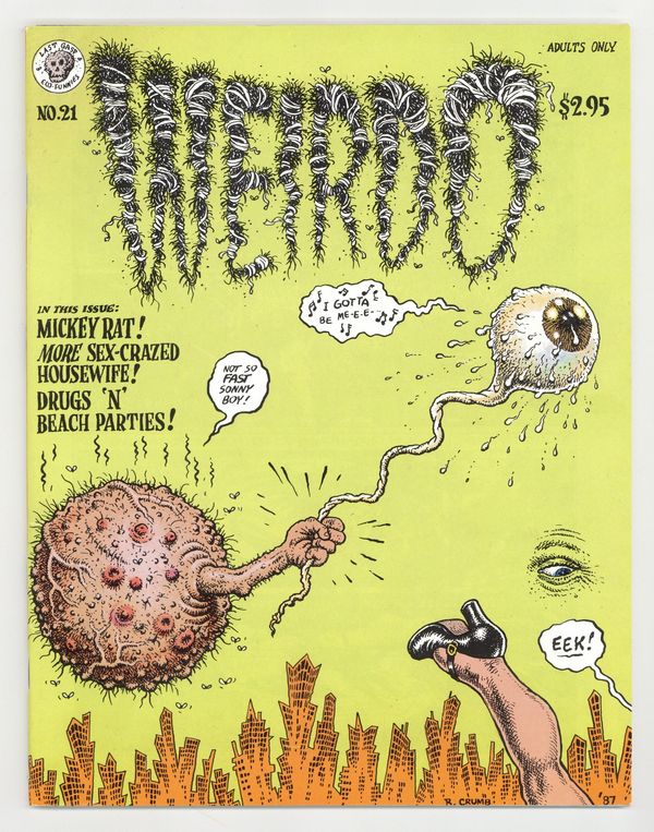 Cover by Robert Crumb. "The Black Cat Bone," script and art by Mary Fleener; How to sacrifice a black cat. Harvey Sez column; Harvey Pekar praises the work of Leonard Rifas and Joyce Brabner's "Real War Stories." "Beach Blanket," script and art by William Clark; Surf teenager Angie wants to experience the wider world. "Sex Crazed Housewife or My Troubles With Men," script and art by Aline Kominsky-Crumb; Aline's late-flourishing attraction to men. Ten illustrations and three comics from early '85 to mid '86 by Robert Crumb. "Suburban Teens on Acid 1969," script and art by Dennis Worden. Untitled story, script and art by Spain Rodriguez; Big Bitch comes across a strange religious town. 44 pgs., B&W. 8-in. x 11-in. $2.95. Cover price $2.95.
