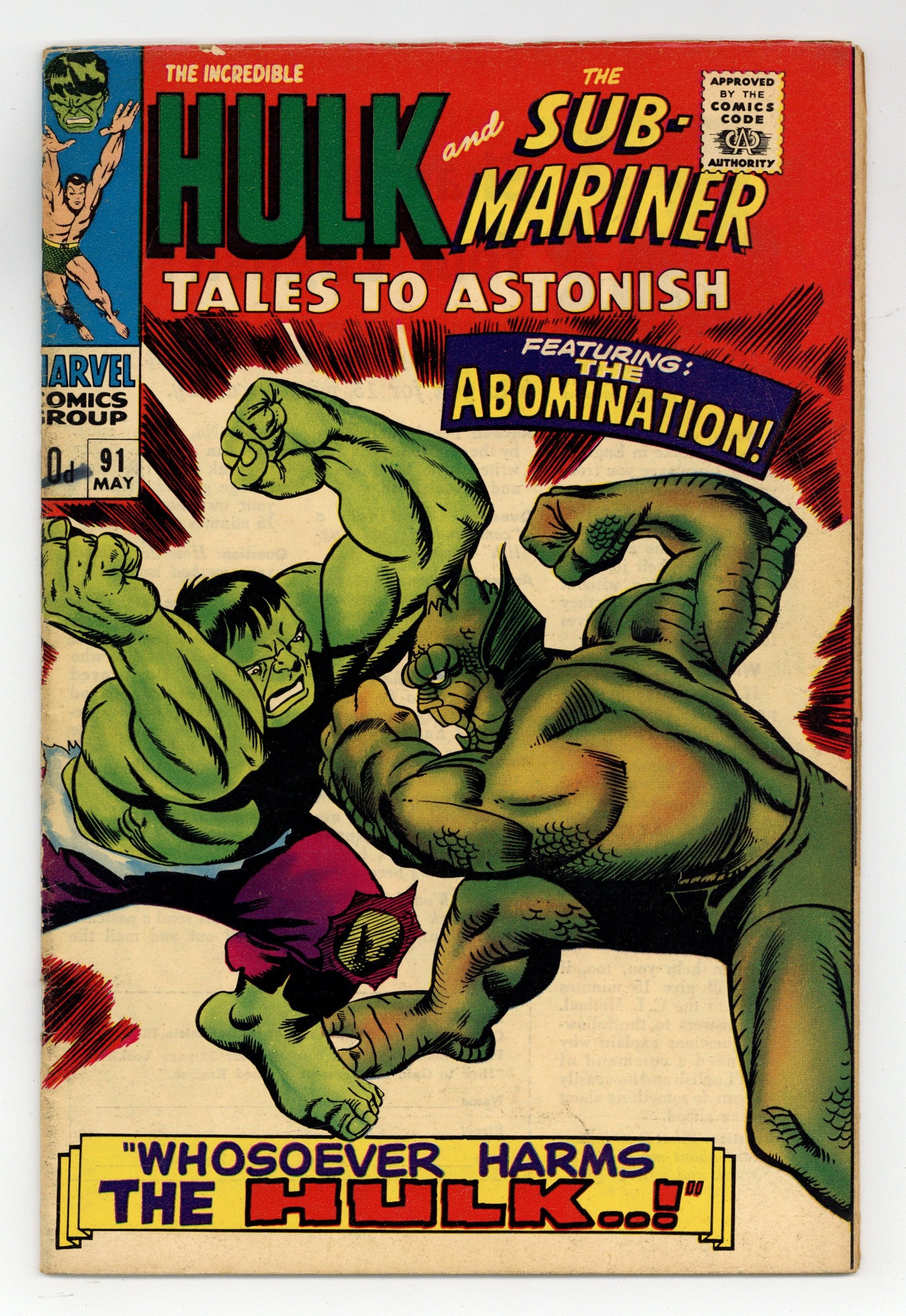 UK edition. Identical to US edition, but has 10d cover price. Cover by Gil Kane. Outside the Gates Waits..Death!, script by Stan Lee, art by Bill Everett and Dan Adkins; As the new ruler of Atlantis, Byrrah has Namor arrested and sent to the dreaded Inferno Isle; Namor battles the lava monster that lives there and returns to Atlantis to seek his vengeance; Meanwhile, back in the undersea kingdom, Dorma has found Byrrah's hypnosis machine that won him the throne and uses it to turn the Atlantean allegiance back to Namor. Whosoever Harms the Hulk..!, script by Stan Lee, art by Gil Kane; Ross and his men try to revive the Hulk after his beating by the Abomnation; Returning from the brink of death, Hulk is about to leave when the pleading Rick Jones causes him to transform back to Banner; Banner uses his knowledge to lure Abomination back to Gamma base with Betty in tow; Hulk and Abomination clash once again; Watching from a distant galaxy, the Stranger realizes that the Abomination is a much better ally than the Hulk and zaps him to his side, ending the battle. 36 pgs., full color.