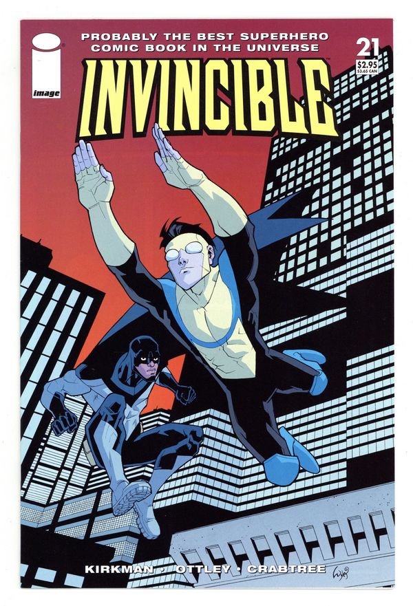 on sale 02.09 $2.95 monthly ongoing series full color, 32 pages written by ROBERT KIRKMAN art by RYAN OTTLEY cover by RYAN OTTLEY & BILL CRABTREE CONCEPT: Mark Grayson is the son of the most powerful superhero on the planet. Recently he's begun to inherit his father's powers, and in doing so, he has learned that everything he's been told is a lie. His father wasn't sent here to protect the planet, he was sent here to enslave it. The only thing that prevented him from succeeding was his own son. But he's still out there, and nobody knows when he will strike again. THIS ISSUE: Return to Midnight City! Cast in the shadow of perpetual darkness, Midnight City lost its sole protector to Omni-Man, Invincible's father, as part of his plot to take over the world. Now many months have passed since the original Darkwing's death, and there's a new Darkwing in town. Invincible is curious to find out just who this guy is. Cover price $2.95.