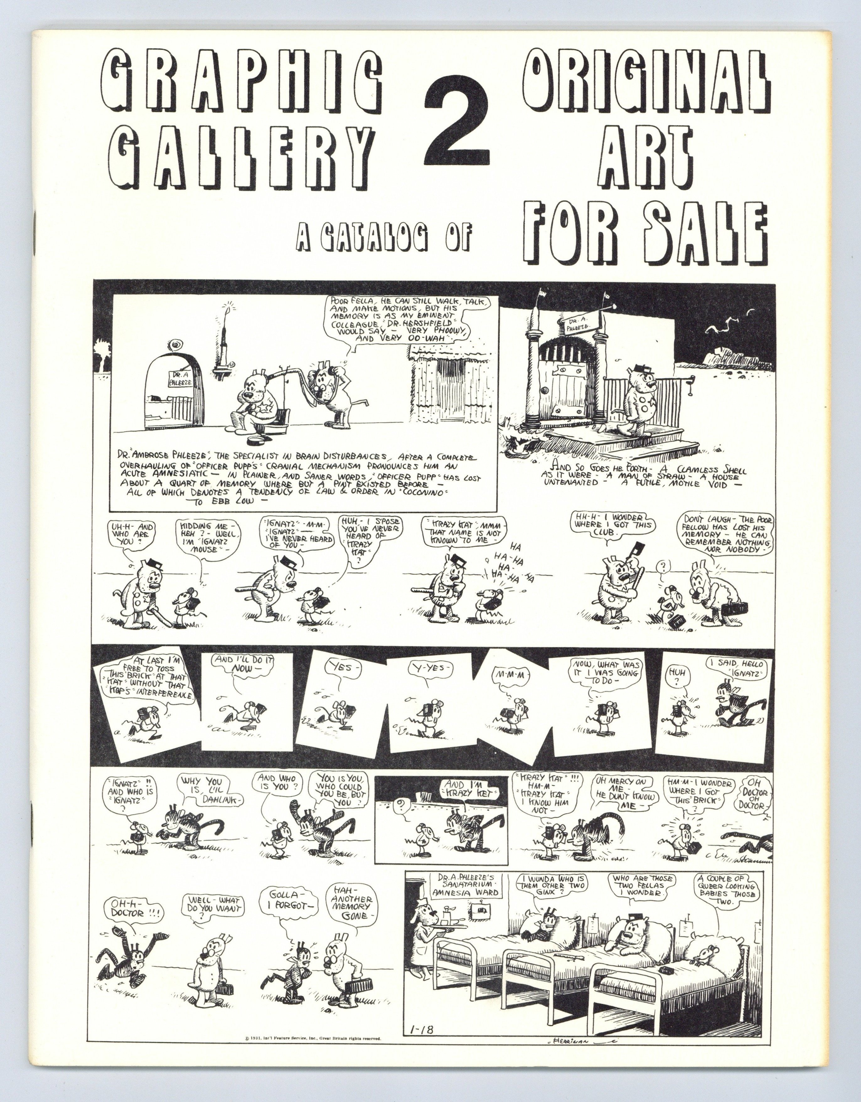 Published 1973 (est.) by Russ Cochran.$20.00Published by Russ Cochran, Graphic Gallery was a fully illustrated catalog of fine original artwork, all of it for sale. Issue #2 includes work by Carl Barks, George Herriman, George McManus, Phil Davis, Jeff Jones, Berni Wrightson, Gil Kane, John Celardo, Al Capp, Basil Wolverton, and others. Cover art by Herriman. 64 pgs. 1973.
