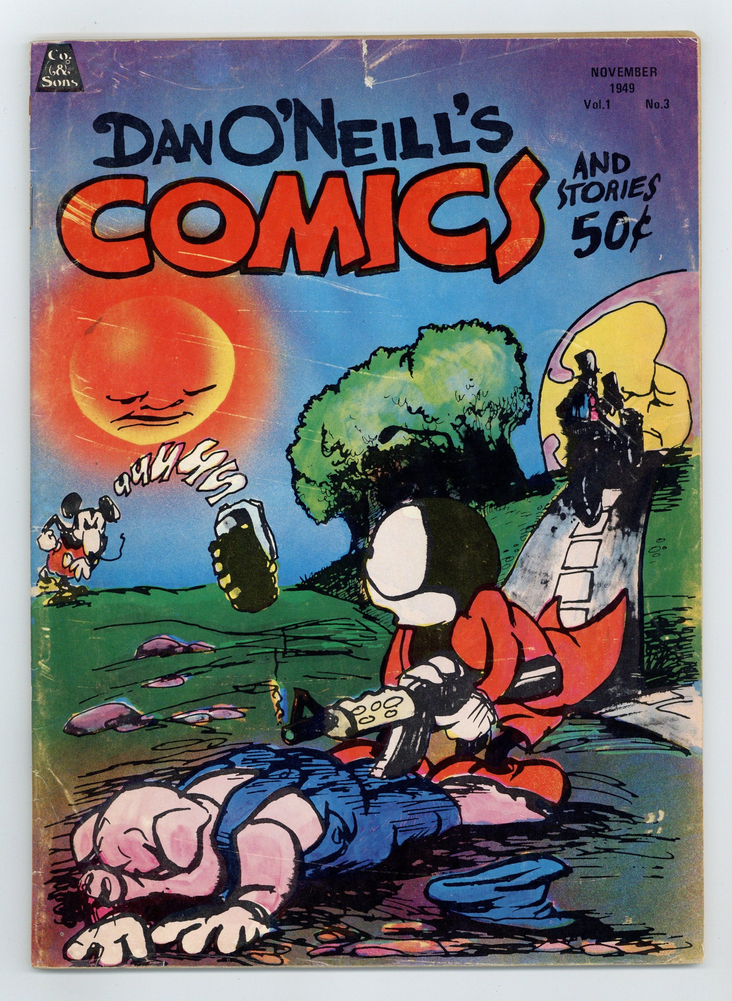 Published 1971 by Comics and Comix Co..$17.50Volume 1, Issue 3 "November, 1949" Story, Art and Cover by Dan O'Neill. Dan O'Neill's scathing satire of political and religious themes using parodied versions of Disney characters and his most famous creations Hugh and Fred earned the ire and outrage of the public and editors alike with his syndicated news paper strip "Odd Bodkins", and eventually led to the loss of his syndication, and job! See what happens when he really lets loose in "Dan O'Neill's Comics"! 7-in. x 10-in., B&W. NOTE: Dates on the cover are used to aid in a parody manner. These issues were published in 1971. Cover price $0.50.