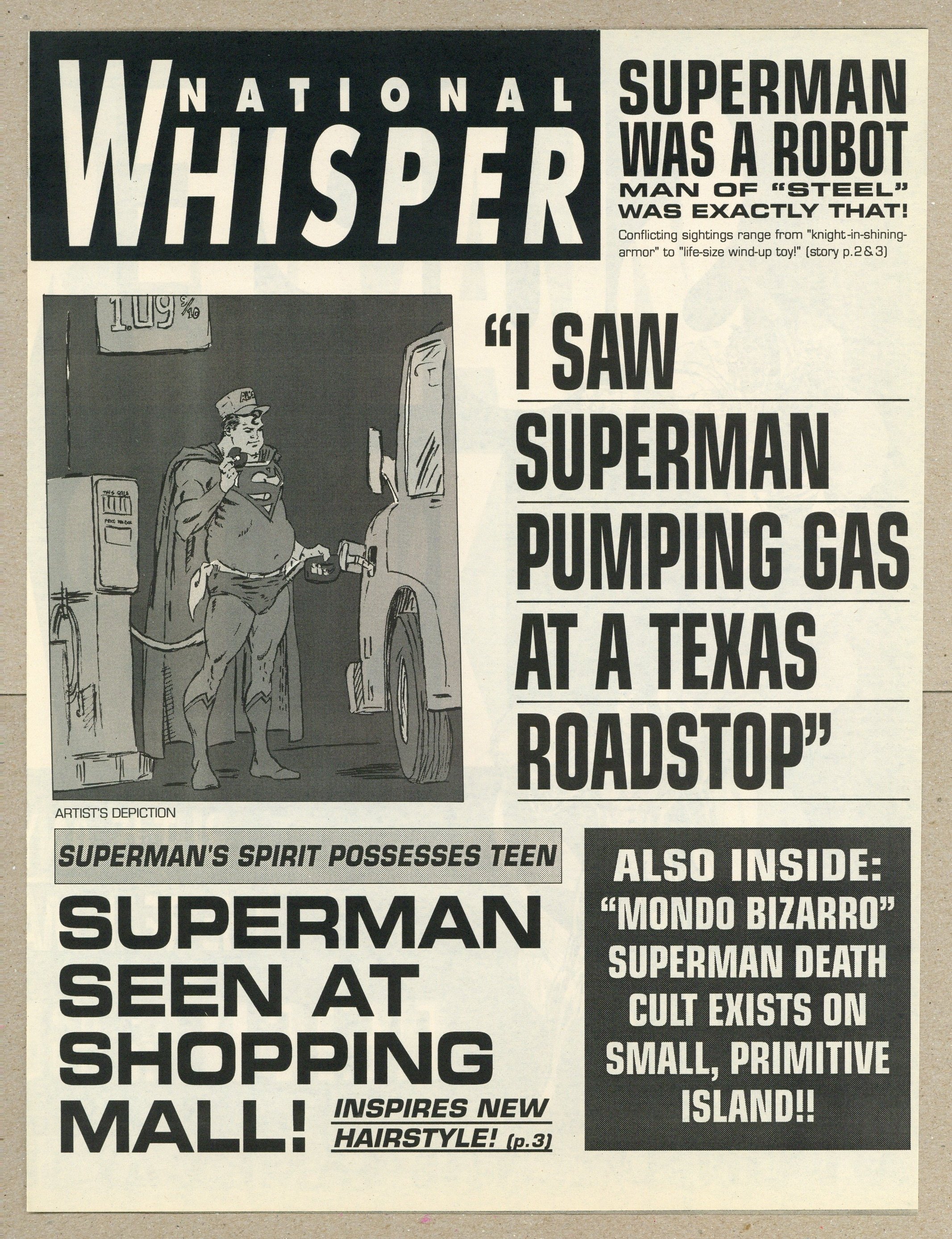After the Death of Superman the National Whisper, the DC Universe's version of the National Inquirer, ran a very "I saw Elvis..." issue. Based in Metropolis, The National Whisper is America's leading tabloid. Printing all sorts of stories, with most of them leaning to the absurd, The National Whisper has run afoul of the Man of Steel on occasion. This 4 page spoof newspaper features such absurd headlines as "I Saw Superman Pumping Gas at a Texas Roadstop," "Superman's Spirit Possesses Teen," "Humongous 'S' Shield Appears in A Kansas Wheat Field," and others. B&W, 10-in. x 13-in.