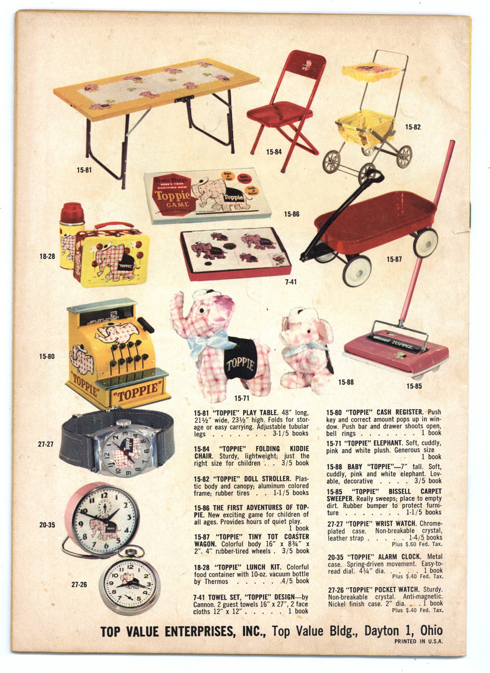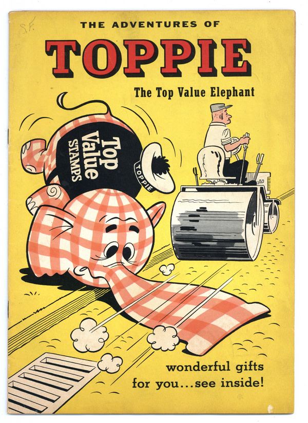 Published 1958 by Top Value Enterprises.$68.00The Adventures of Toppie the Top Value Elephant (1958) is a promotional comic book distributed to children by the Top Value Stamp Co. Top Value Stamps were similar to Green Stamps. Stamps were earned by the customer with each purchase, then redeemed later with the stamp company for various premiums. 32 pages, full color.