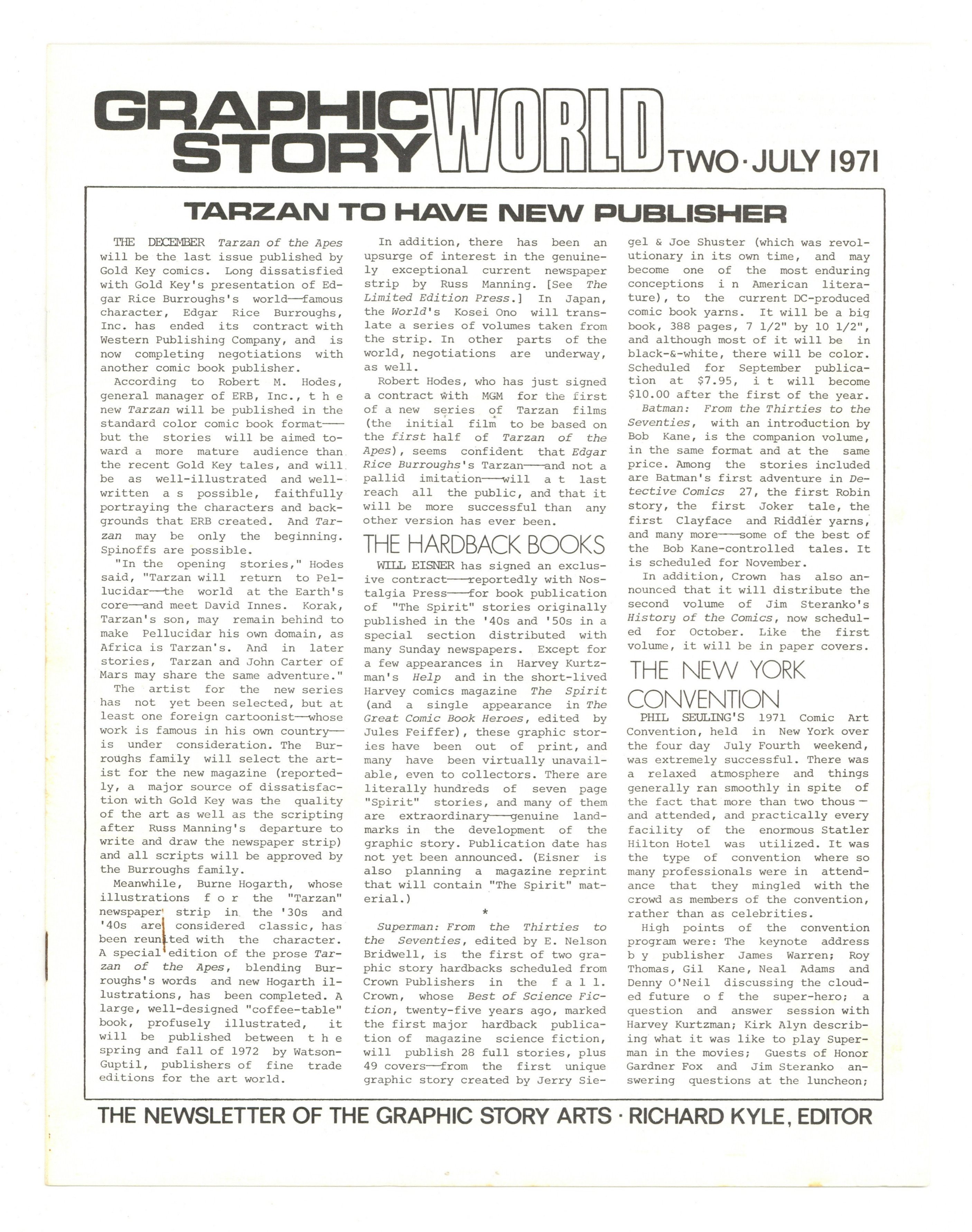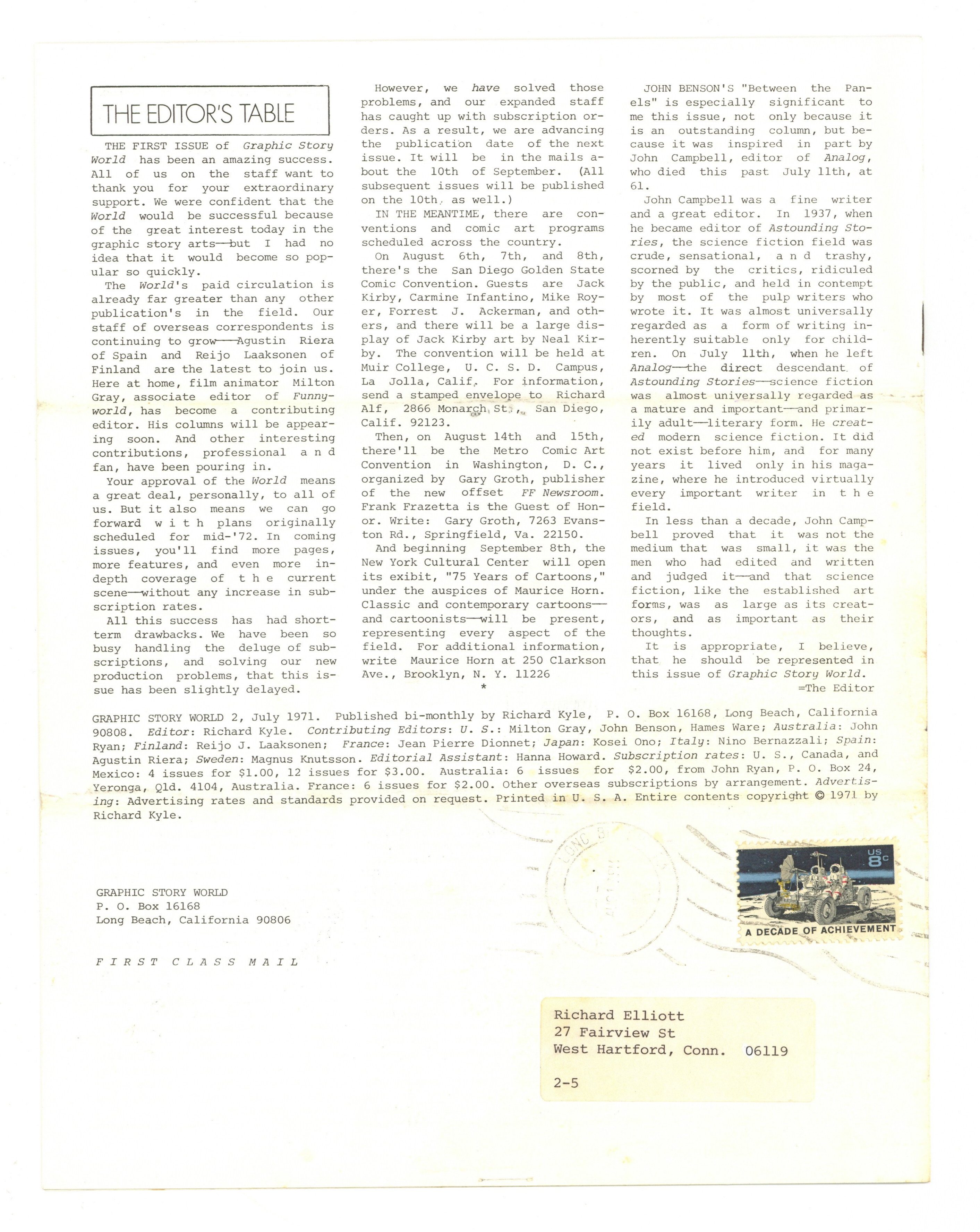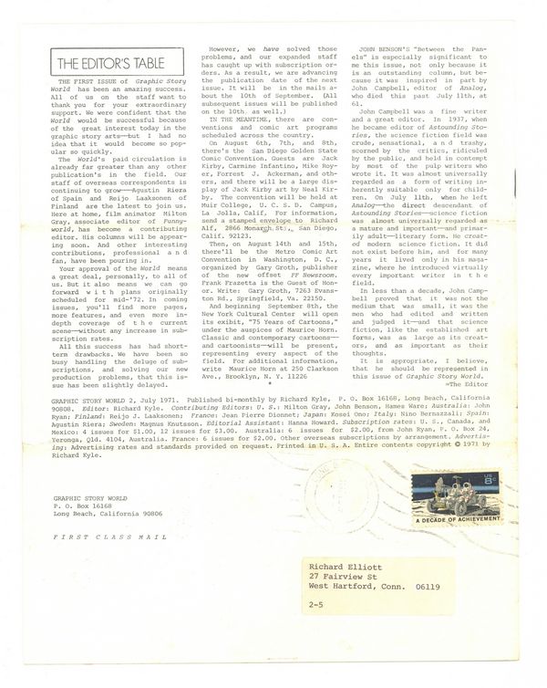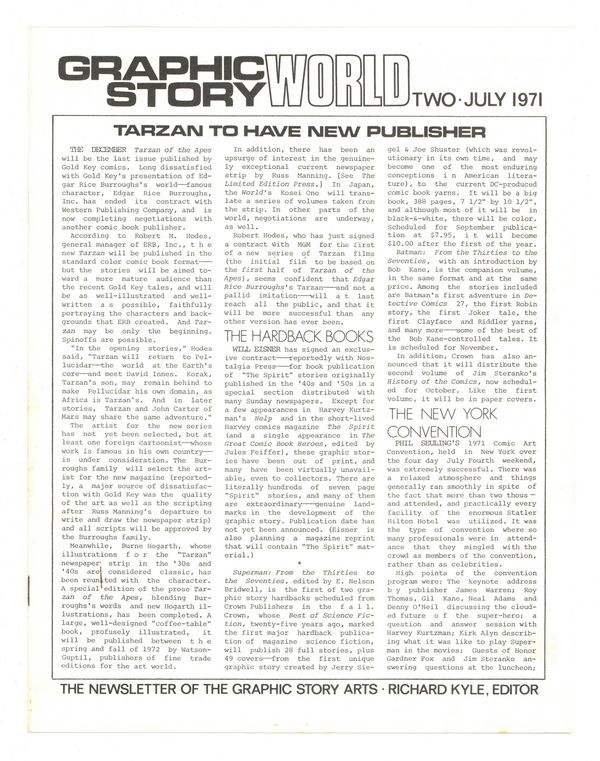 $13.50July 1971. Graphic Story World is a newsletter edited by Richard Kyle covering the entire spectrum of graphic arts: Underground Comix, Comic Books, Animated Films, Books, & more. This issue: in his feature article "Between the Panels", John Benson discusses the importance of dialogue balloons in graphic story telling, and lots more. 8 1/2" x 11"; black and white; 12 pages. Cover price $0.40.