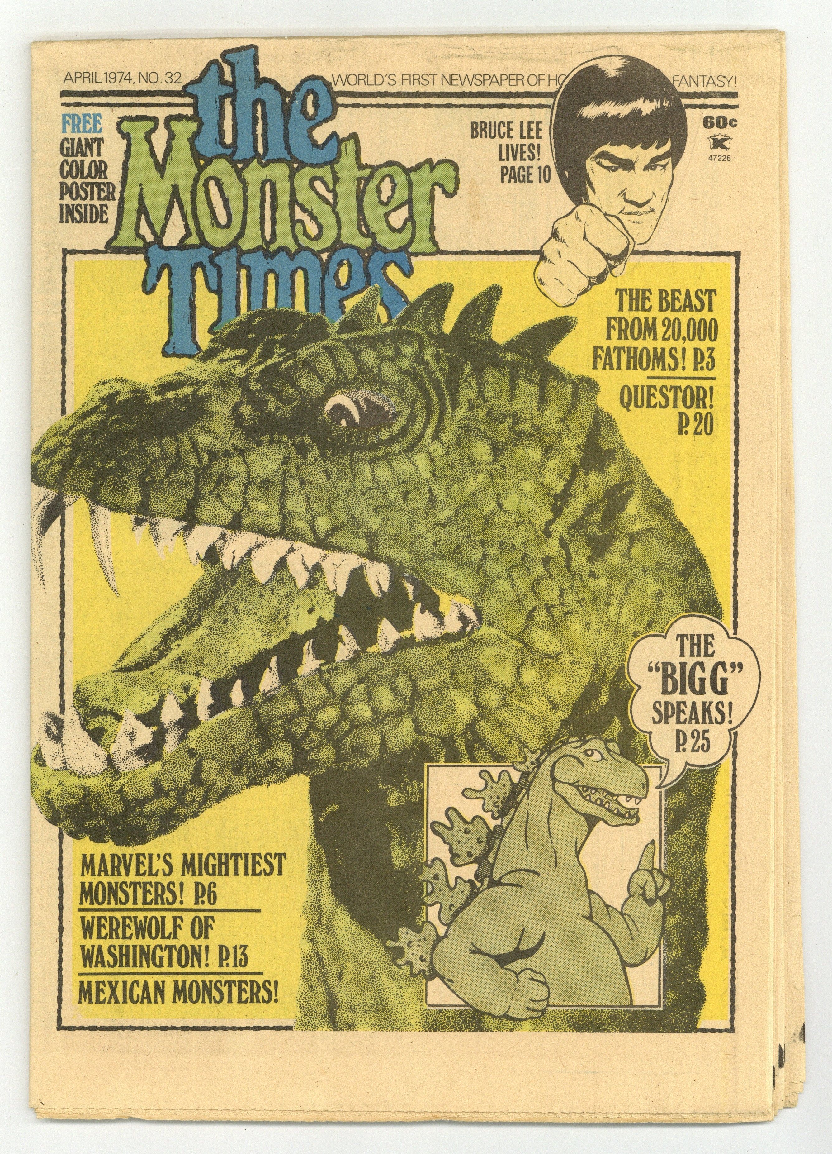Published Apr 1974 by Monster Times Publishing.$18.00The World's First Newspaper of Horror, Sci-Fi and Fantasy! This issue: Marvel's Mightiest Monsters! Werewolf of Washington! Mexican Monsters! The Beast from 20,000 Fathoms! Questor! Bruce Lee Lives! Plus - Free Giant Color Poster Inside. Cover price $0.60.