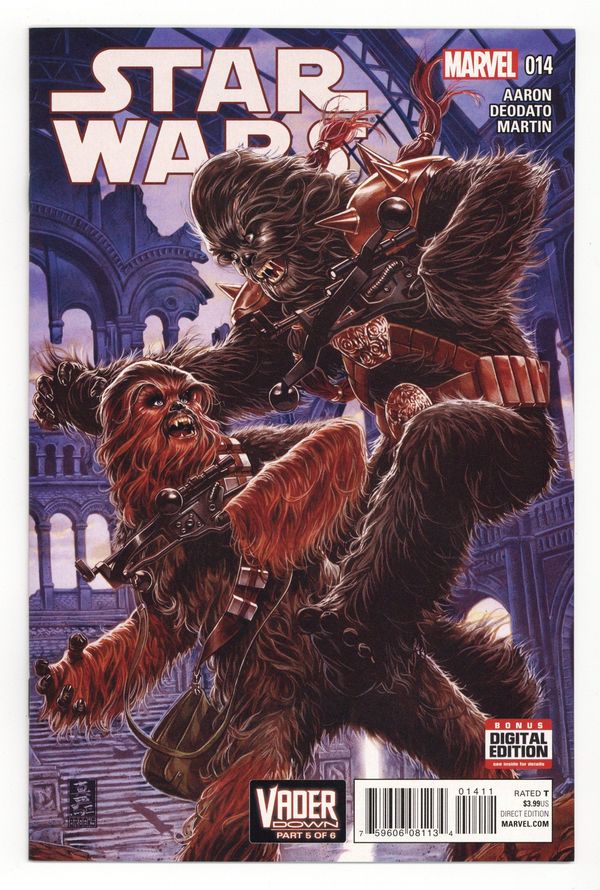Vader Down: Part 5 of 6 - Written by Jason Aaron. Art by Mike Deodato. Cover by Mark Brooks. Story continued from Darth Vader (2015 Marvel) #14. VADER DOWN, PART FIVE CHEWBACCA VERSUS BLACK KRRSANTAN! What else do you need? Marvel's first Star Wars event continues! Story continues in Darth Vader (2015 Marvel) #15. 28 pages, full color. Rated T Cover price $3.99.