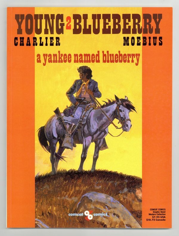 Published Mar 1990 by Comcat Comics.$25.00Volume 2 - 1st printing. "A Yankee Named Blueberry!" Stories by Jean-Michel Charlier, plus an introduction by Randy and Jean-Marc Lofficier. Art and cover by Jean Giraud, credited as Gir but better known as Moebius. Translation by Randy and Jean-Marc Lofficier. The early life of Western hero Lt. Blueberry, featuring art by legendary Heavy Metal artist Moebius. Blueberry's early years in the American Civil War change him from the racist son of a wealthy plantation owner into a Yankee bugler fighting for the Union. Deathride; Manhunt; Private Mike S. Blueberry; plus a stand-alone Western gag cartoon from Moebius, Nuggets and Thieves. Includes annotations on panels that were changed or omitted in reprints. Softcover, 8-in. x 11-in., 56 pages, full color. Cover price $7.95. Cover price $7.95.