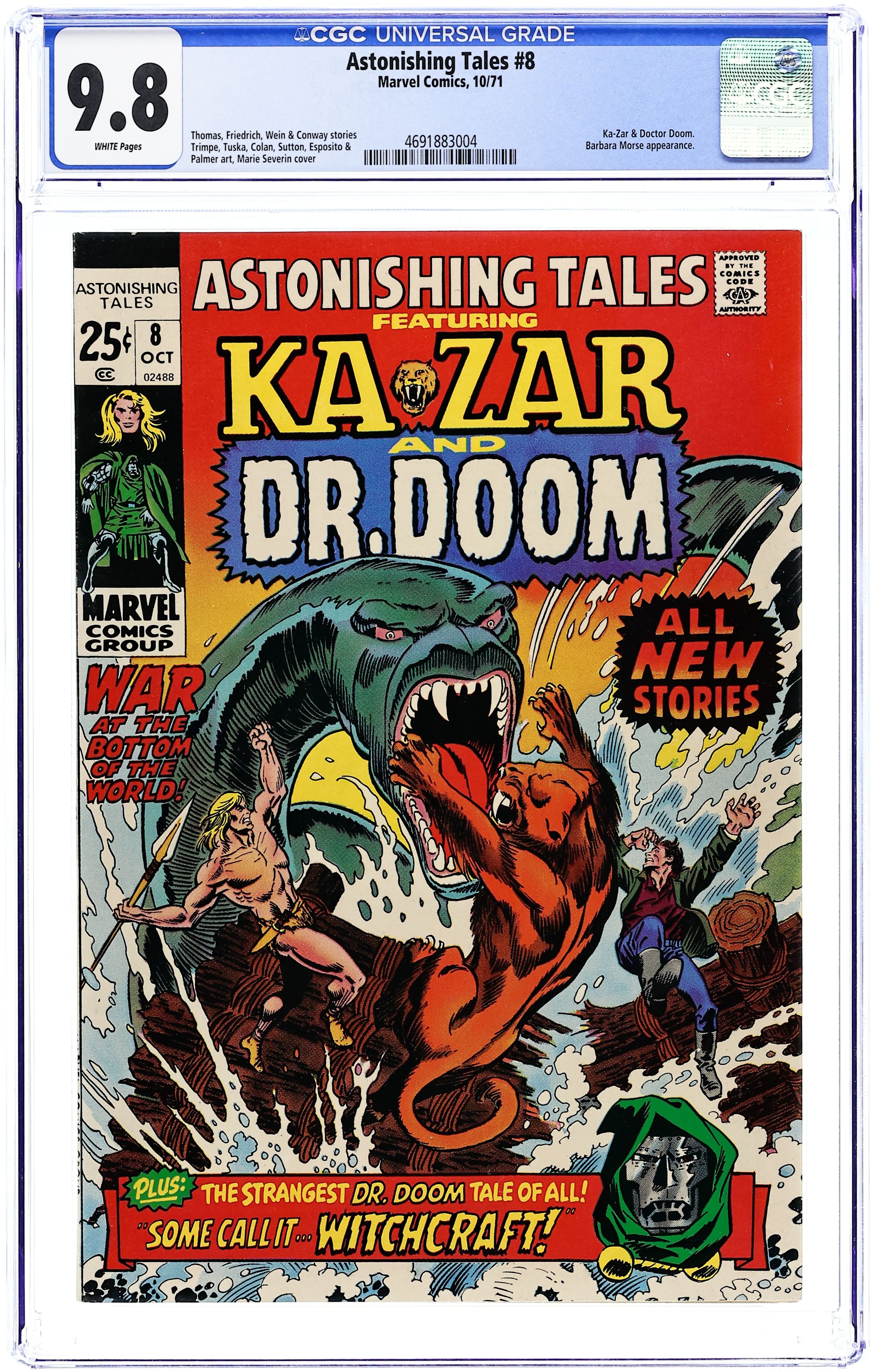 Cover pencils by Marie Severin, inks by Frank Giacoia. The Battle of New Britannia!, script by Roy Thomas and Gary Friedrich, pencils by Herb Trimpe, inks by Tom Sutton; While flying to see Ka-Zar in the Savage Land Barbara Morris and Paul Allen crash, with Paul being saved by Ka-Zar and Barbara being rescued by the British of New Britannia. Ka-Zar and Paul don't know that Barbara has been saved so they venture into the Lost Lake to save her. Advertisement reproducing covers for Fantastic Four King-Size Special #9 and Spider-Man King-Size Special #8. This Badge Bedeviled!, script by Len Wein and Mike Friedrich (plot), pencils by George Tuska, inks by Mike Esposito; While Damian Link is trying to stop a robbery he and his twin brother Joshua Link are somehow linked together by experimental rays. ...Though Some Call It Magic! starring Doctor Doom, script by Gerry Conway, pencils by Gene Colan, inks by Tom Palmer. Advertisement reproducing covers for Thor King-Size Special #4 and Marvel Feature #1. 48 pgs. $0.25. Cover price $0.25.
