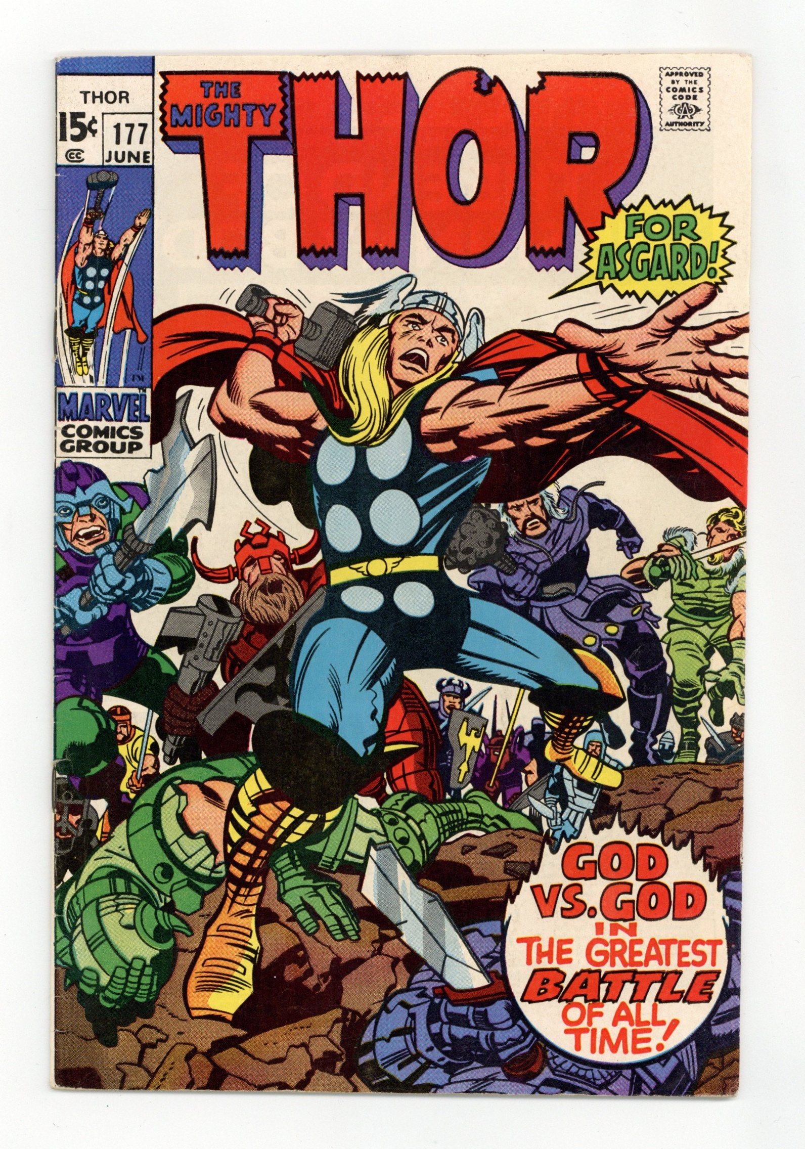Tags: Marvel Legacy Numbering: Thor (part 177), Thor$16.75Cover pencils by Jack Kirby, inks by John Verpoorten. "To End in Flames!", script by Stan Lee, pencils by Jack Kirby, inks by Vince Colletta; While seeking to escape the destruction of Asgard at the hands of Surtur, Loki and one of his followers escape to Earth, however they find that Surtur's coming has also caused environmental upheaval on Earth itself, leaving Loki to hope that his hated half-brother finds some way to defeat Surtur; While back in Asgard, the royal city has been set ablaze by the coming of Surtur, prompting Thor to gather an army of warriors to fight against the fire demon. Appearances by Balder, Karnilla, Fandral, Volstagg, and Hogun. Letter to the editor from comics artist Alan Kupperberg. 36 pgs., full color. $0.15. Cover price $0.15.