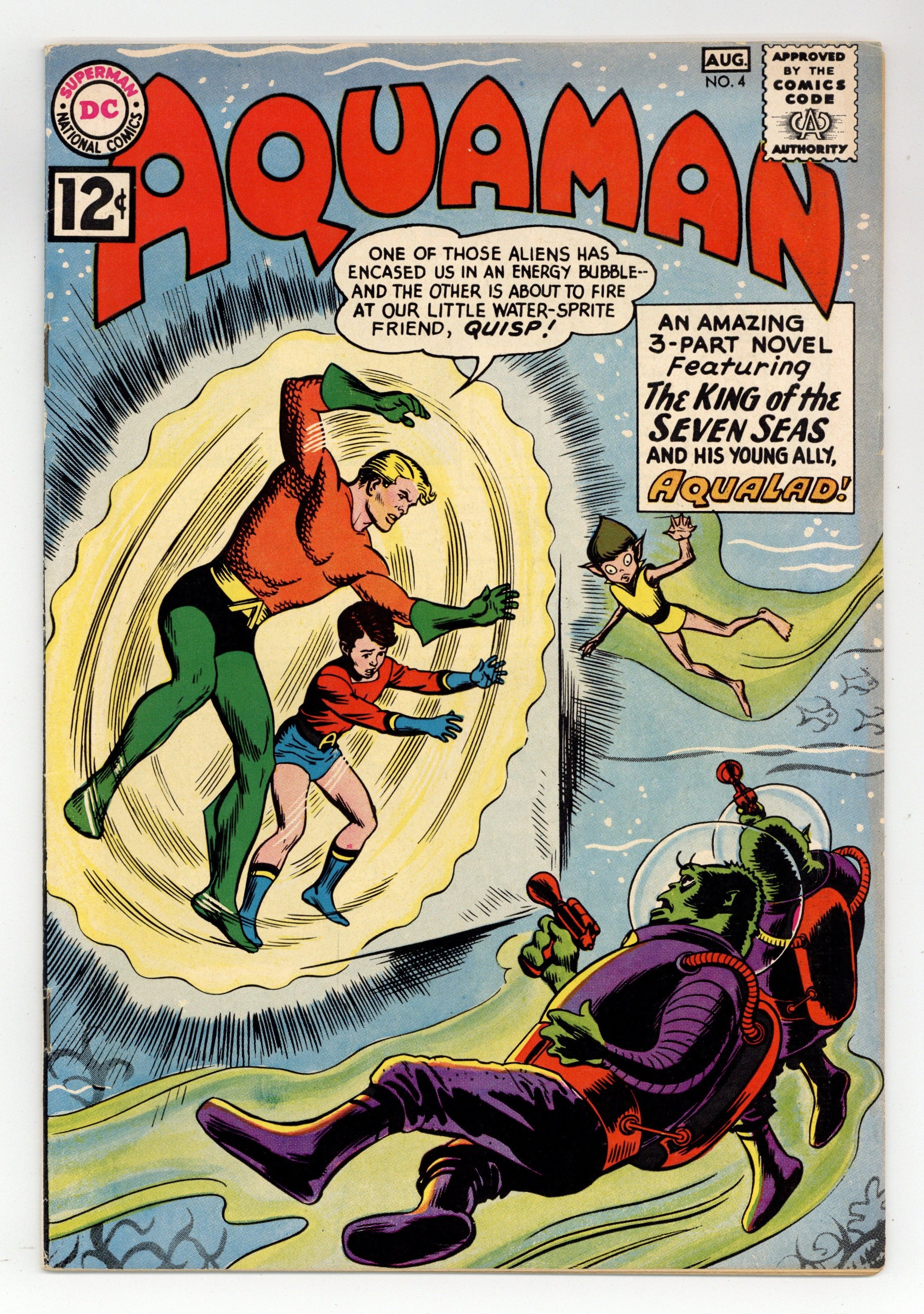 Cover art by Nick Cardy. The Menace Of Alien Island, art by Nick Cardy; Aquaman and Aqualad discover a floating island that is really an alien spaceship. Ollie humor page by Henry Boltinoff. Hands Across the Channel fact page by Henry Boltinoff. The Underwater "Spaceship" article. 36 pgs. $0.12. Cover price $0.12.