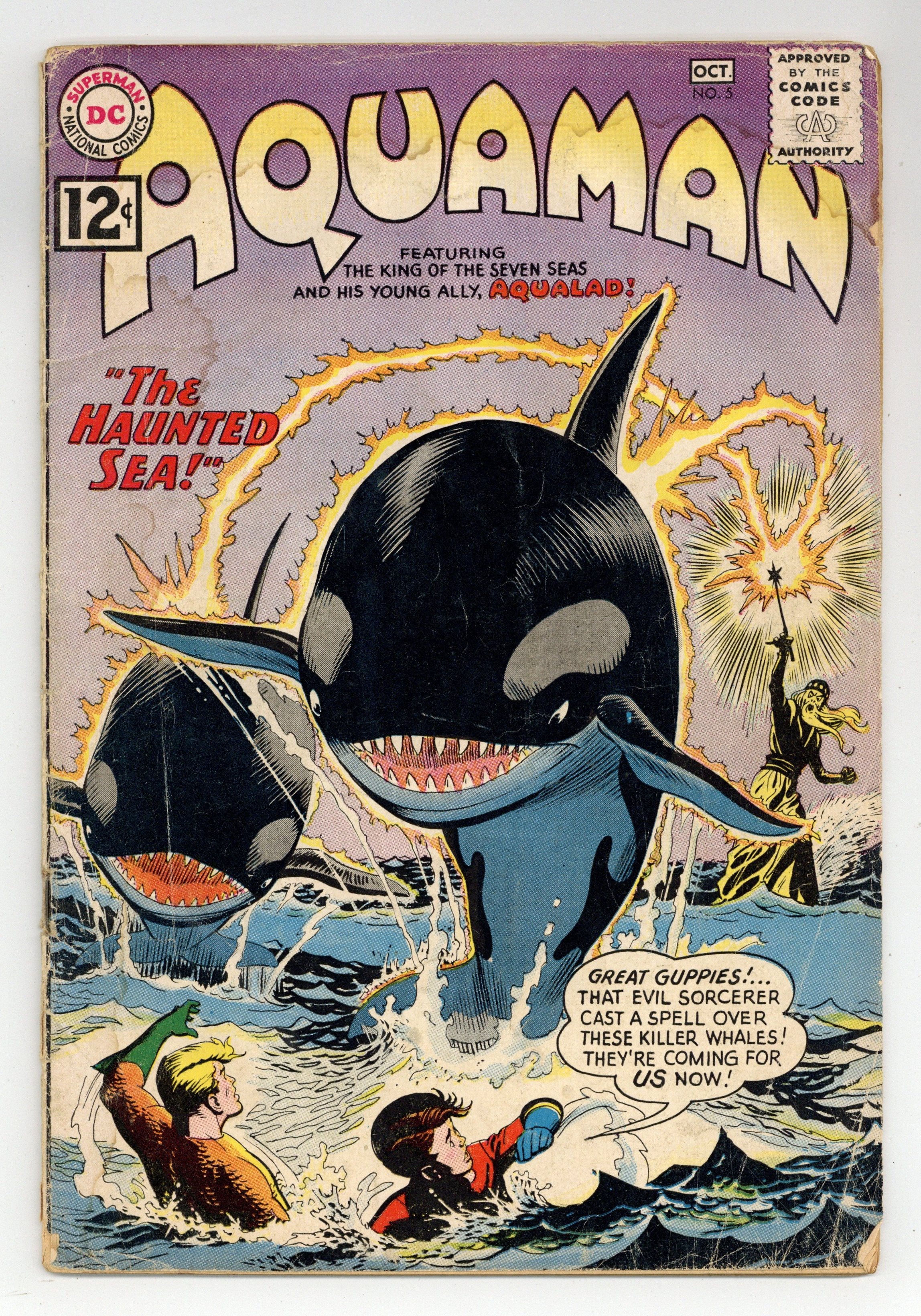 Cover art by Nick Cardy. The Haunted Sea, art by Nick Cardy; Aquaman and Aqualad accidentally free an evil sorcerer from the drop of water he and his henchmen were imprisoned in. Pioneers Under the Sea article. 36 pgs. $0.12. Cover price $0.12.