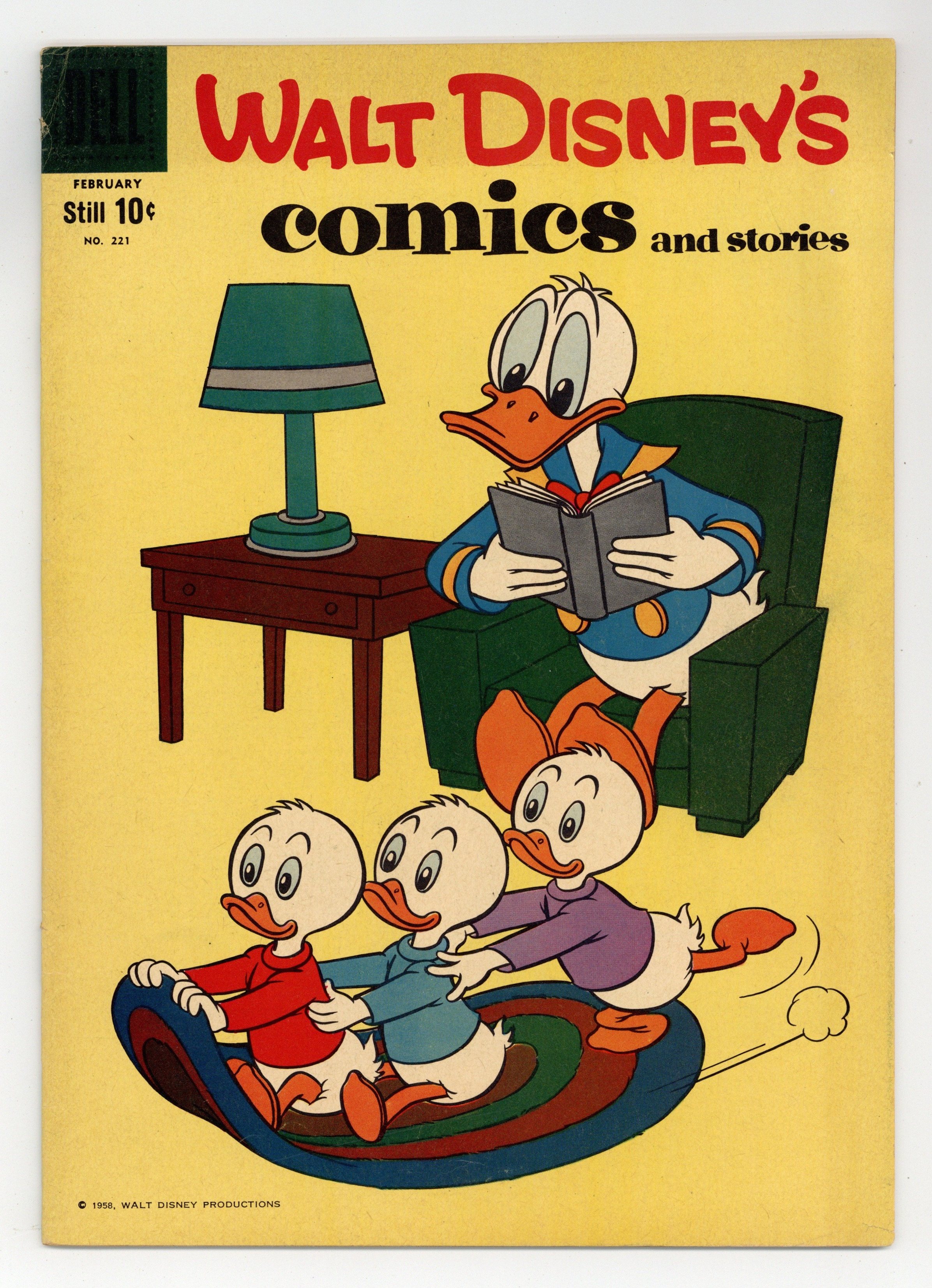 Tags: Disney Ducks & MicePublished Feb 1959 by Dell/Gold Key.$17.25Cover by Tony Strobl. Stories and art by Carl Barks, Carl Fallberg, Jack Bradbury, Paul Murry, Manuel Gonzales, Al Hubbard, Bob Karp, and Al Taliaferro. Sometimes listed as Vol. 19 #5. The long-running vehicle for Disney character comics featured art by Carl Barks, the legendary Good Duck Artist. Reports of the monster of Sawtooth Valley cause a media circus. In a story by Barks, Huey, Dewey and Louie track a prospector to his claim. Scamp meets a prairie dog during a visit to the desert. Donald Duck; Scamp; Chip 'n' Dale; The Skating Party; Mickey Mouse: The Monster of Sawtooth Mountain. 32 pages, Full Color. Cover price $0.10.