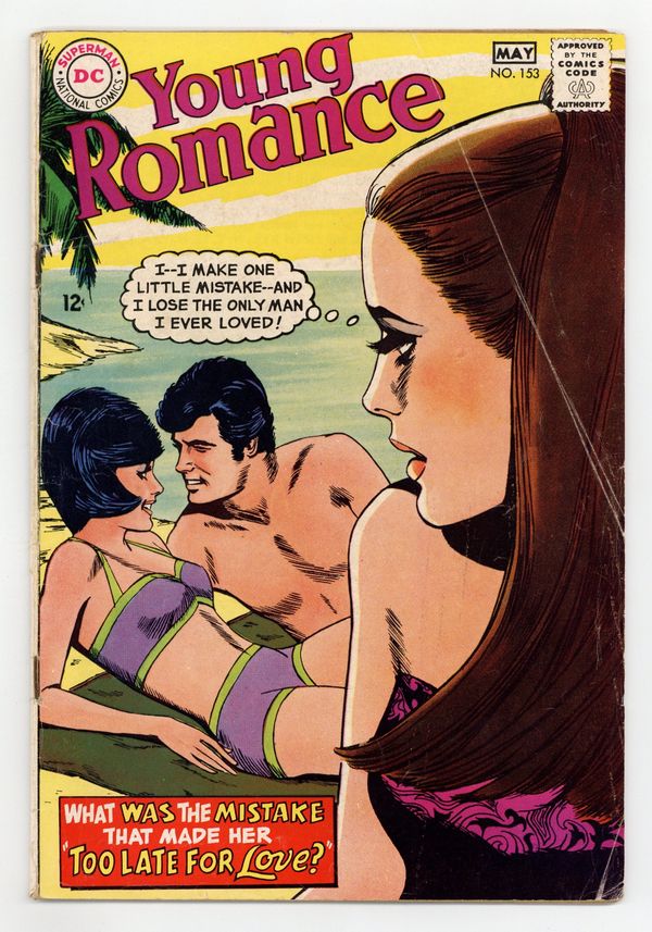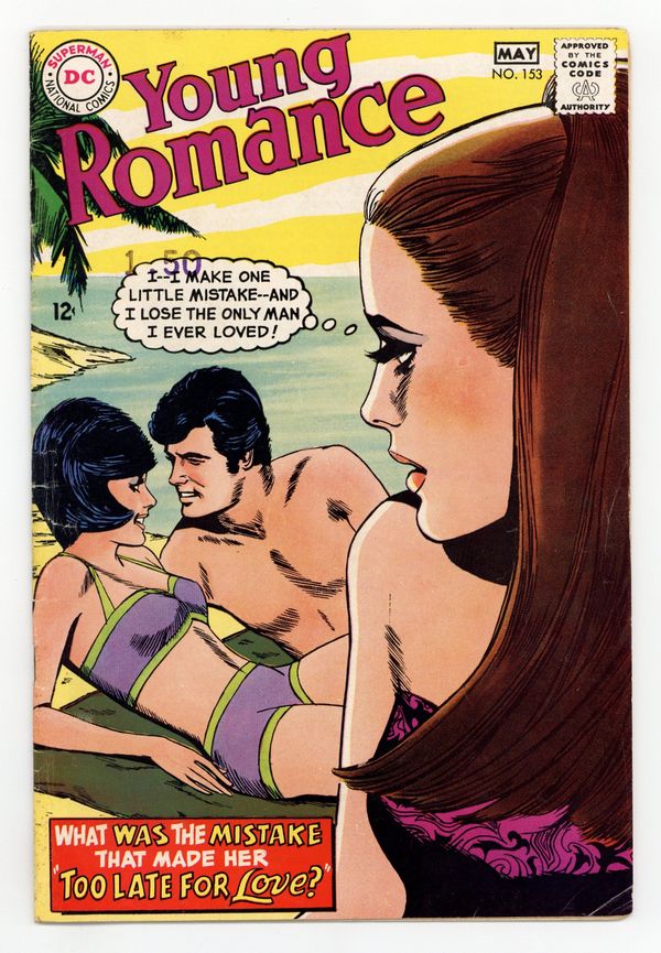 Cover pencils by Tony Abruzzo. Stories by unknown. Art by Tony Abruzzo, Howard Purcell, Jay Scott Pike and unknown. Two people notice each other at a vacation resort, but each mistakenly believes the other is with someone else in "Too Late for Love"! Also featuring "Love is Just a Word" and "Stranger to My Heart"! Plus: Mad Mad Modes for Moderns 2-pager! And: Laura Penn...Your Romance Reporter letters page. 32 pages, full color. Cover price $0.12.
