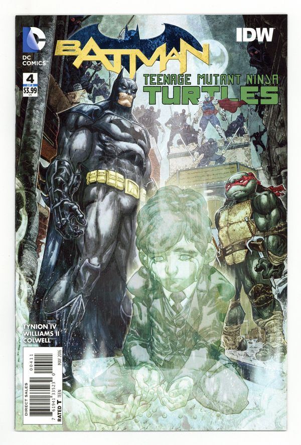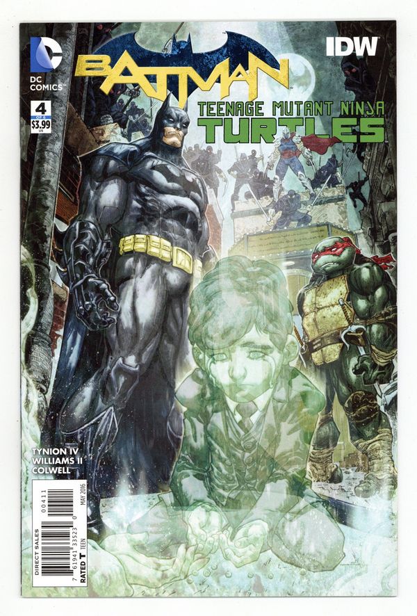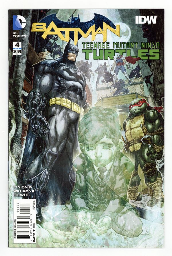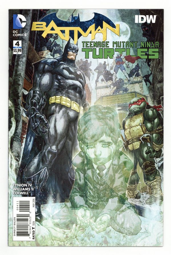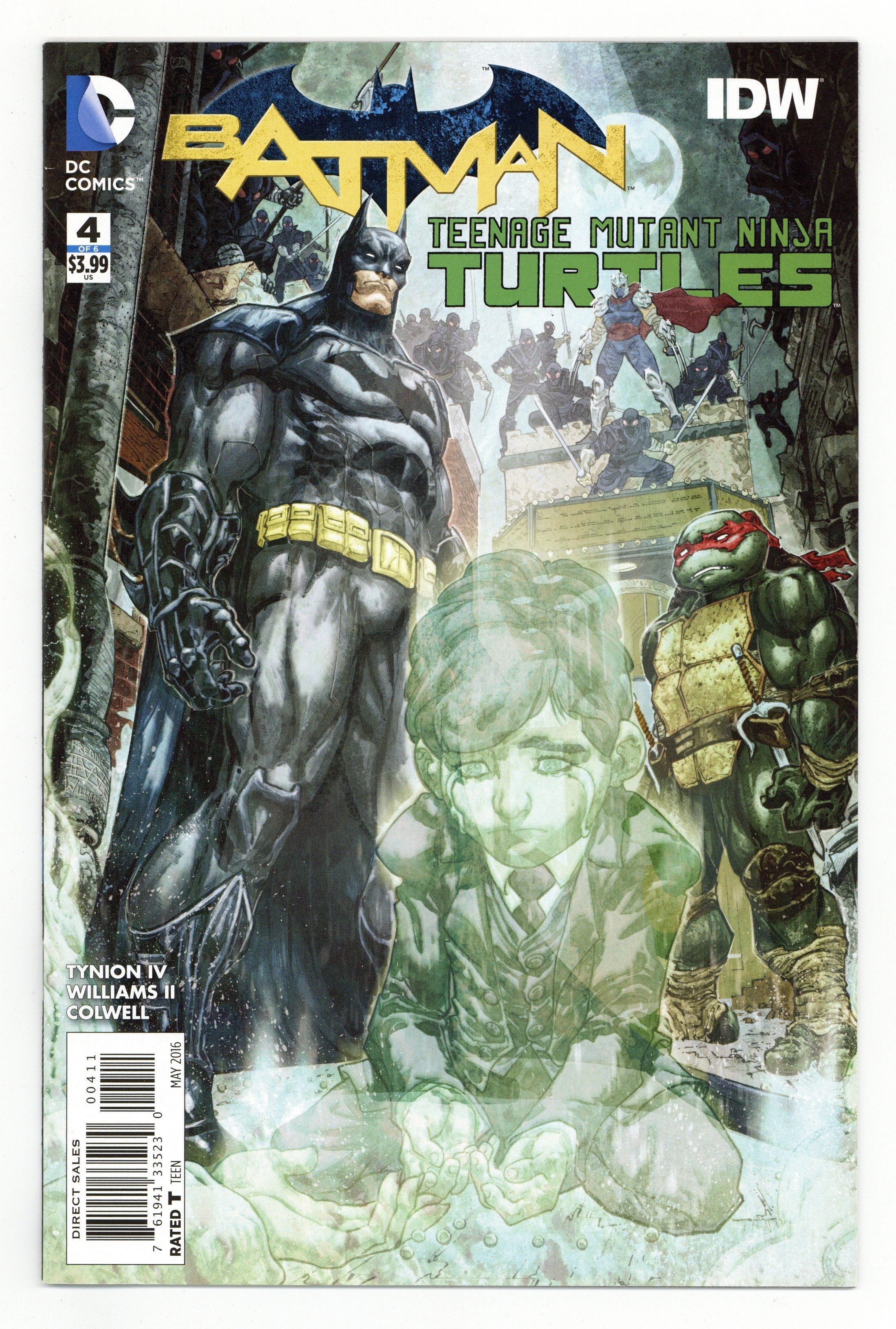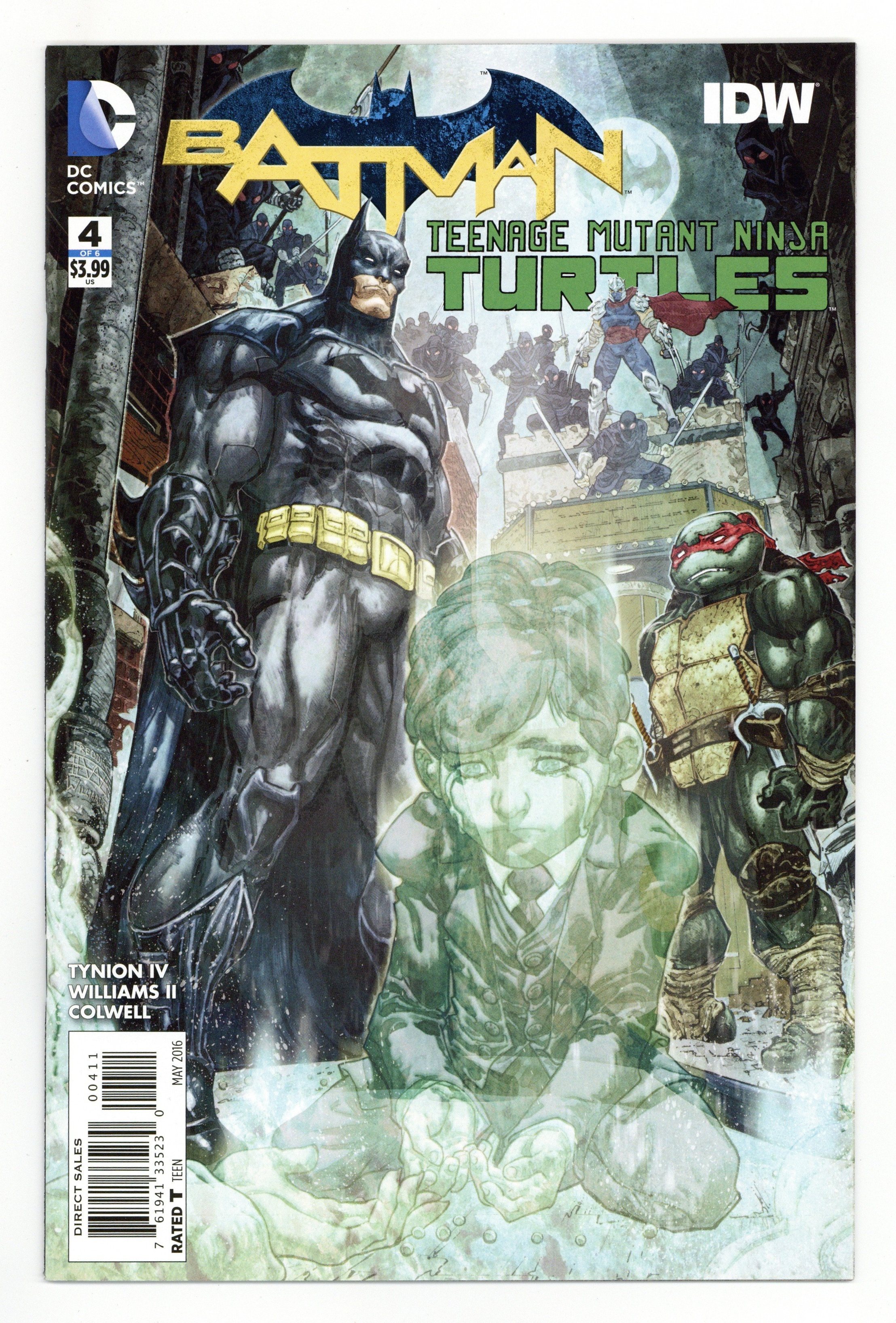 Written by James Tynion IV. Art and Cover by Freddie Williams II. With the possibility existing that they might never get home, the Turtles take up residence at Wayne Manor. Everyone seems to be adapting except for Raphael, who still can't understand why his friends all trust this Bat-person. So Batman takes the skeptical Turtle on a trip down Crime Alley to tell Raph what led him to don the cape and cowl in the first place. Co-published with IDW. 32 pages, full color. Rated T Cover price $3.99.