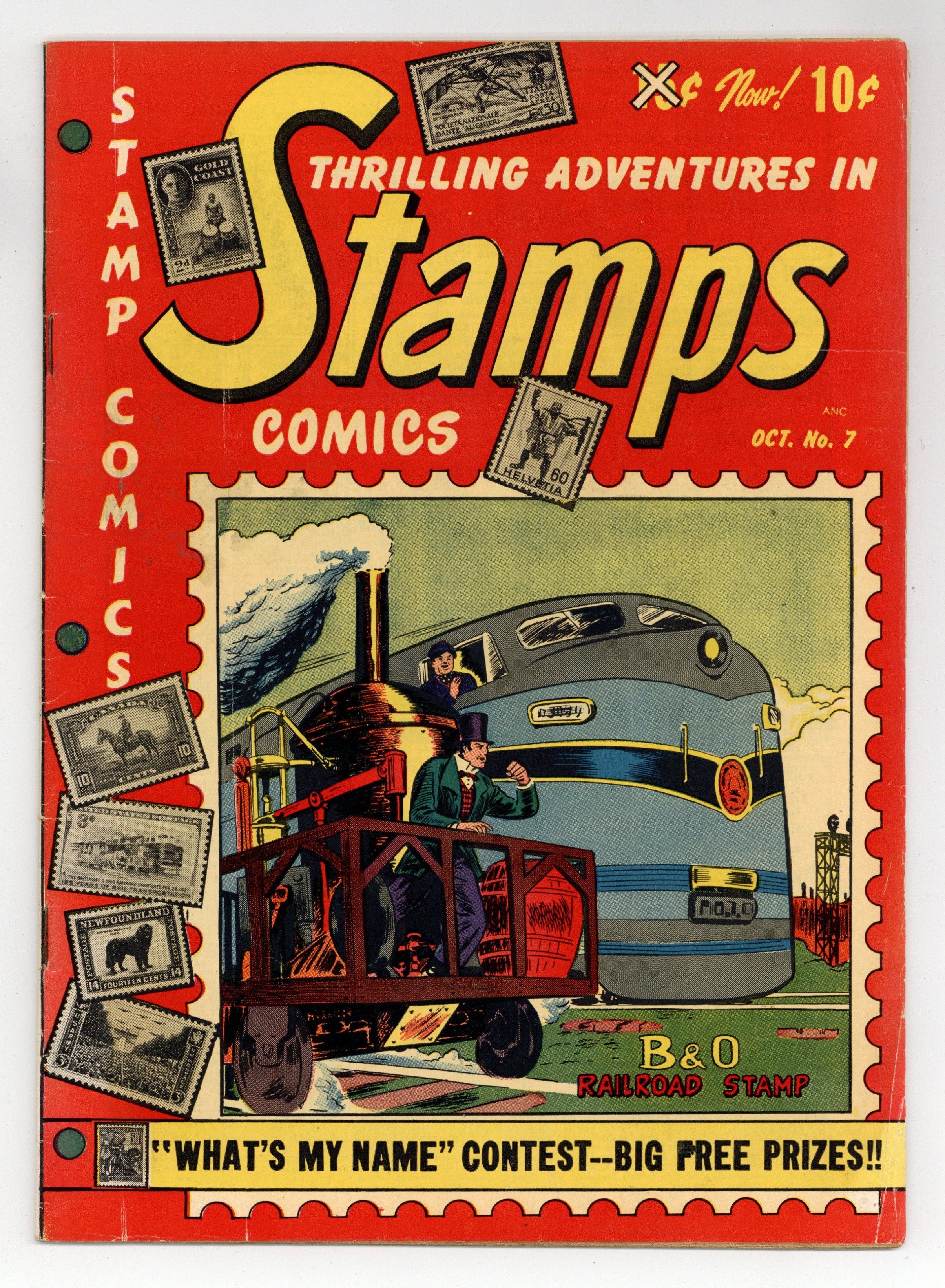 Stories and art by Doug Wildey, Walter Palais, H. C. Kiefer, Roy G. Krenkel, and Vince Napoli. Stories from comics artists inspired by (and featuring) classic collectible stamps, for a rare series that combines panelology with philately. General "Mad Anthony" Wayne and his forces face a confederacy of Native tribes in 1790s America, in a story with early art by Doug Wildey. The "true" story of legendary archer William Tell, who trusted his own son's life to his skill with the bow. Witnessing a pitched battle, Francis Scott Key is inspired to write the American anthem. B & O Railroad Stamp; Get Your Man; U. S. Army Stamp; William Tell, The Man Who Faced A Tyrant; Oddities in Stamps; Stamp Errors and Rarities; The Battle of Fallen Timbers; Francis Scott Key and the Star Spangled Banner; Rex Saves a Life; What's My Name? Final issue under this title; series continues as Thrilling Adventures in Stamps Comics (1953) #8. 32 pages, Full Color. Cover price $0.10.
