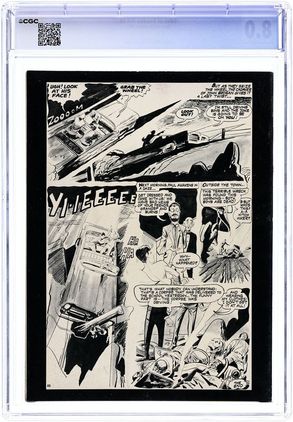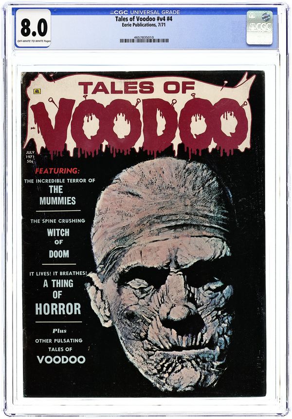 Photo cover features Boris Karloff as The Mummy. Stories and art by Carl Burgos, Torre Repiso, Ezra Jackson, Torre Repiso and Hector Castellon. Legendary publisher Eerie's fondly remembered tales of horror and the macabre, many "reanimated" from classic pre-Code horror comics with new art. After a disfiguring auto accident, a man is pursued by a monstrous weathervane. A woman buys a love potion from a witch to steal her sister's boyfriend, but it turns out the witch had a better idea. A monstrous spirit warns mountain climbers scaling Mt. Everest to turn back. Painted cover by Johnny Bruck is reprinted from Germany's Perry Rhodan. A Thing of Horror; The Witch of Doom; Curse of the Sword; The Frozen Mummies; Swamp Monsters; Terror in the Attic; Zombie For a Day. 8 1/2-in. x 11-in. 48 pages, B&W. Mature readers. Cover price $0.50.