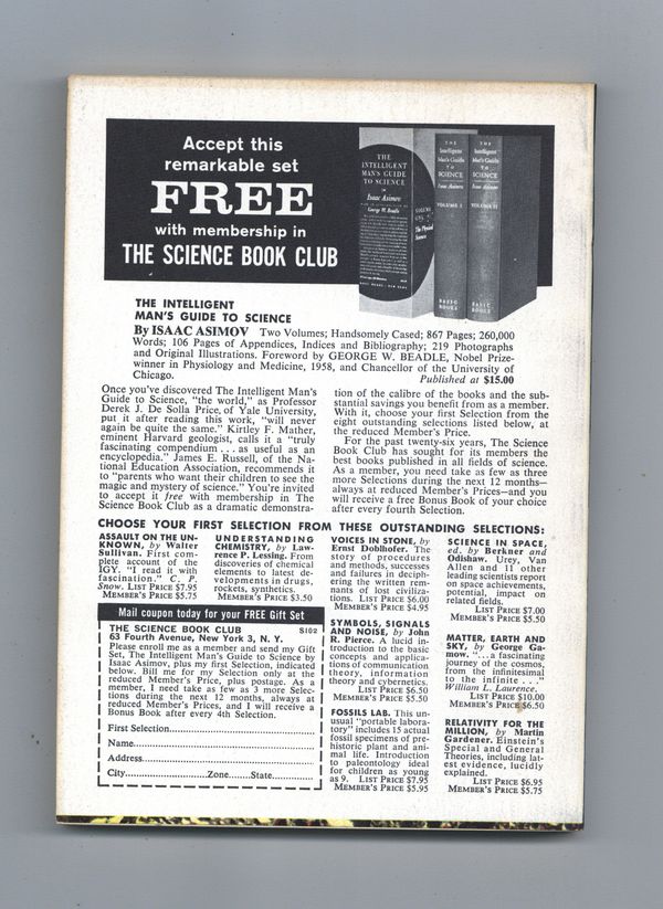 Volume 23 Issue 6 - December 1962. Cover by Chelsey Bonestell. Fantasy and Science fiction stories by Jim Harmon, Grendel Briarton, Russell Kirk, Felix Marti-Ibanez, Isaac Asimov, Frederik Pohl, Avram Davidson, Sasha Gilien, Gordon R. Dickson, and Henri Damonti. Softcover, 5-in. x 7-in., 130 pages, B&W. Cover price $0.40.