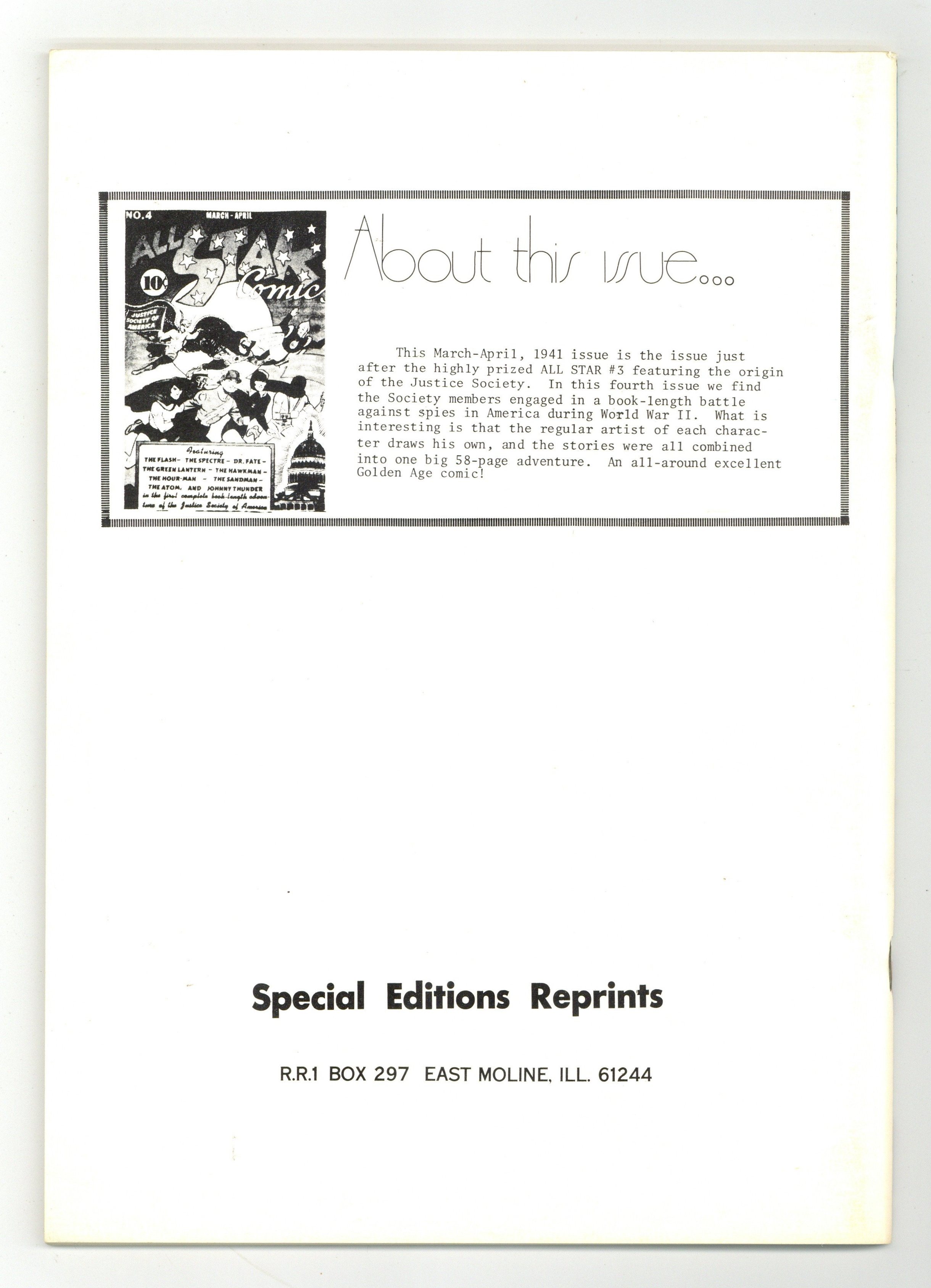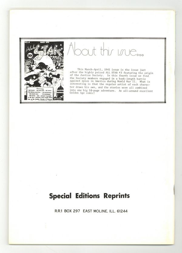 The sixth issue of the Flashback reprint series presents ALL STAR #4 originally published in 1941. Cover art by Everett E. Hibbard. "For America and Democracy!", script by Gardner F. Fox, art by Everett E. Hibbard (pages 1-10, 55-58), Martin Nodell (pages 11-17), Bernard Baily (pages 18-30), Howard Sherman (pages 31-36), Craig Flessel (pages 37-42), Sheldon Moldoff (pages 43-49), and Ben Flinton (pages 50-54); The JSA closes in on Fritz Klaver, who threatens to blow up everyone rather than be captured; But the JSA overpowers the Grey Shirts while Dr. Fate's occult powers halt Klaver in his tracks; Later, the JSA reports to the FBI Chief that their assignments have been successfully completed. "A Fortune Teller's Fortune" text story starring Johnny Thunder, art by Sheldon Meyer. Ad for The Flash. 68-pages, full color cardstock covers, 7-3/4-in. x 10-3/8-in. black-and-white interior on white paper stock, saddle-stitched binding. Cover price $3.00.