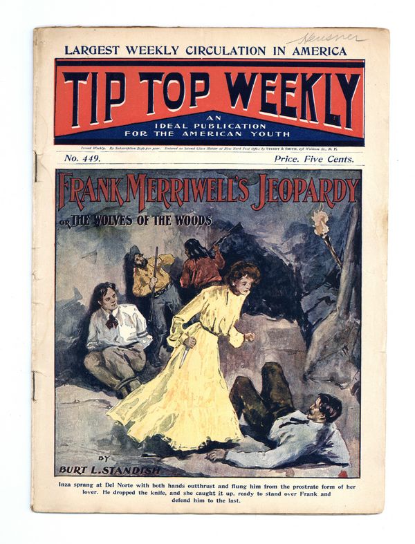 November 19, 1904. Written by Burt L. Standish (Gilbert Patten). Tip Top Weekly was promoted as "An Ideal Publication for American Youth," and was primarily devoted to the continuing adventures of student Frank Merriwell, who started at a fictional New England academy and then went to Yale, eventually becoming an international adventurer. Newsprint. 8.25-in. x 10.5-in. 32 pages, Text. Cover price $0.05.