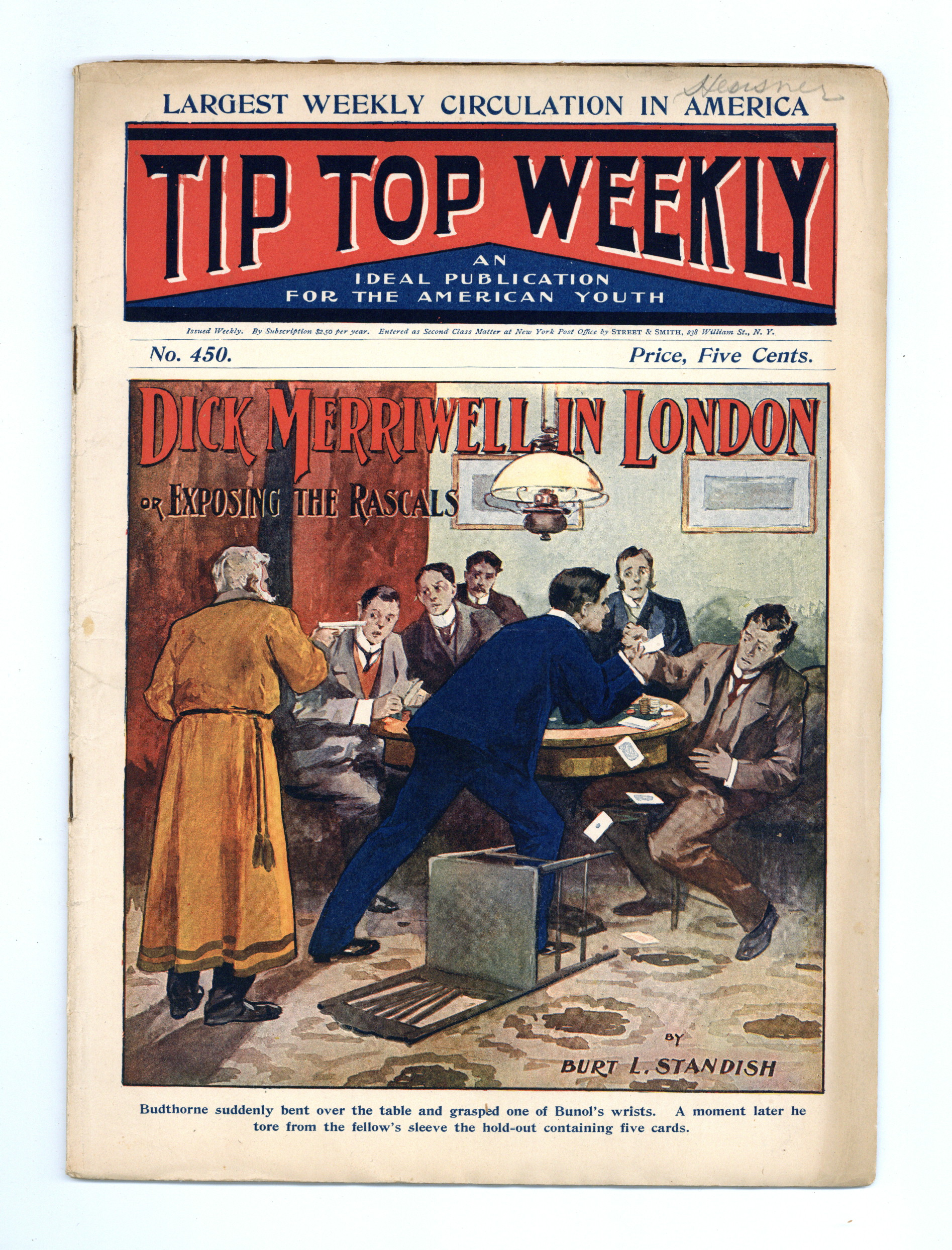November 26, 1904. Written by Burt L. Standish (Gilbert Patten). Tip Top Weekly was promoted as "An Ideal Publication for American Youth," and was primarily devoted to the continuing adventures of student Frank Merriwell, who started at a fictional New England academy and then went to Yale, eventually becoming an international adventurer. Newsprint. 8.25-in. x 10.5-in. 32 pages, Text. Cover price $0.05.
