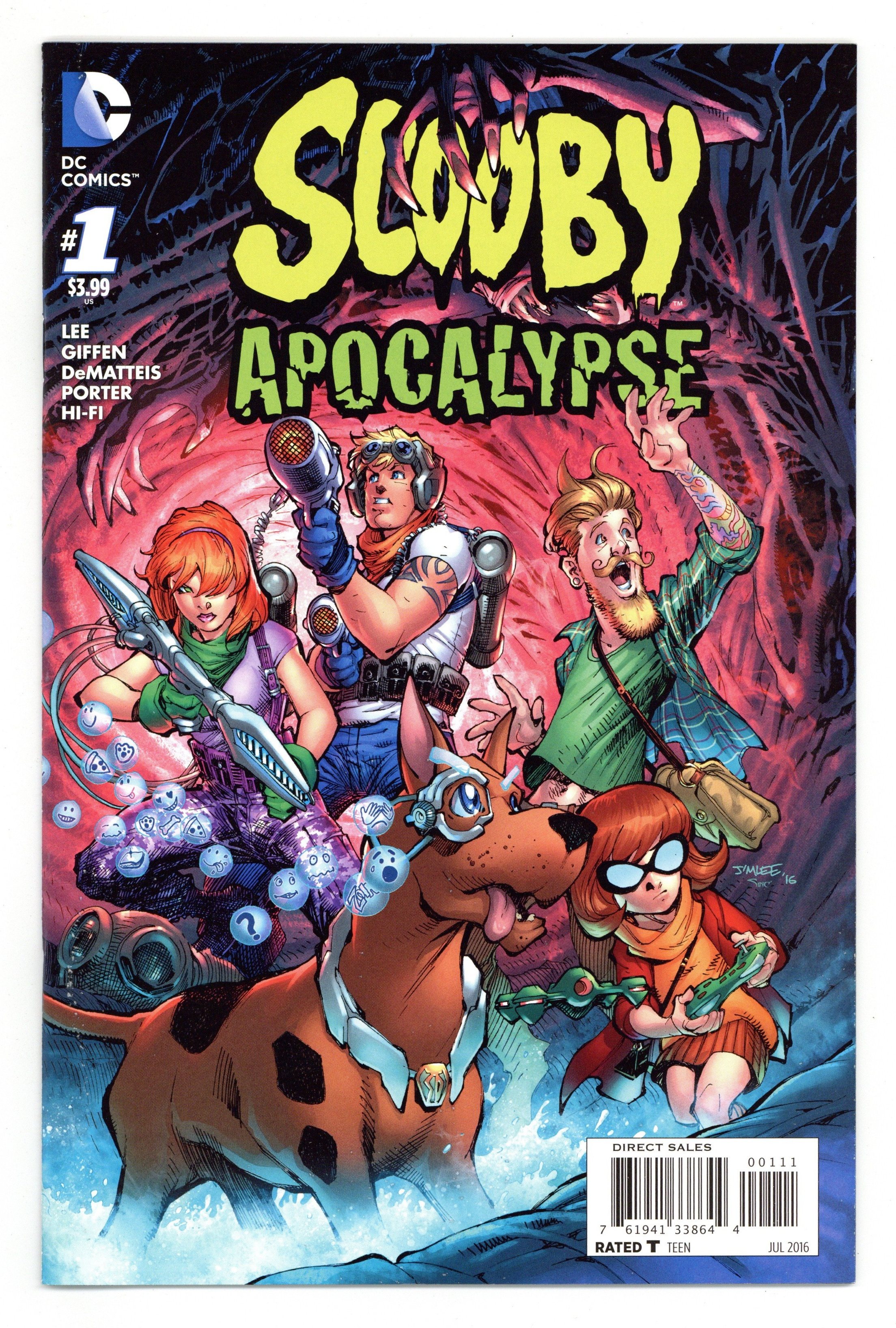 $21.50Written by Jim Lee, Keith Giffen and J.M. DeMatteis. Art by Hank Porter. Cover by Jim Lee. Those meddling kids-Fred, Daphne, Velma, Shaggy, and their dog, Scooby-Doo-get more ghost-debunking than they bargained for when faced with a fundamental change in their world. The apocalypse has happened. Old rules about logic no longer apply. The creatures of the night are among us, and the crew of the Magical Mystery Machine has to fight to survive-because in the apocalyptic badlands of the near-future, the horrors are real! This new monthly series takes Scooby and the gang to a whole new level and features character designs by comics superstar Jim Lee! 40 pages, full color, Rated T Cover price $3.99.