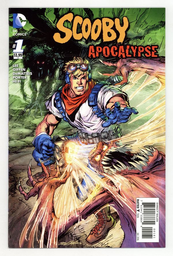 Written by Jim Lee, Keith Giffen and J.M. DeMatteis. Art by Howard Porter. Cover by Neal Adams. Those meddling kids-Fred, Daphne, Velma, Shaggy, and their dog, Scooby-Doo-get more ghost-debunking than they bargained for when faced with a fundamental change in their world. The apocalypse has happened. Old rules about logic no longer apply. The creatures of the night are among us, and the crew of the Magical Mystery Machine has to fight to survive-because in the apocalyptic badlands of the near-future, the horrors are real! This new monthly series takes Scooby and the gang to a whole new level and features character designs by comics superstar Jim Lee! 40 pages, full color, Rated T Cover price $3.99.
