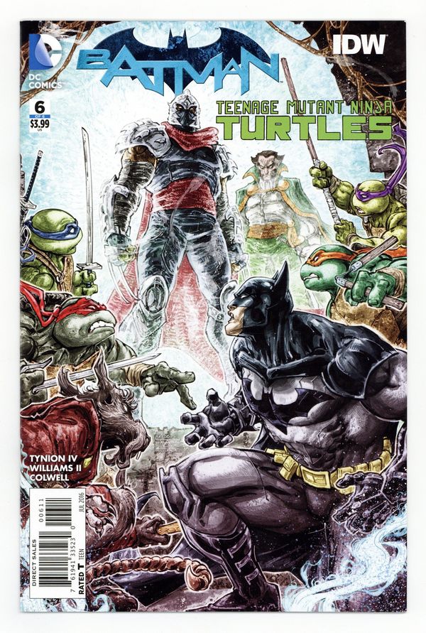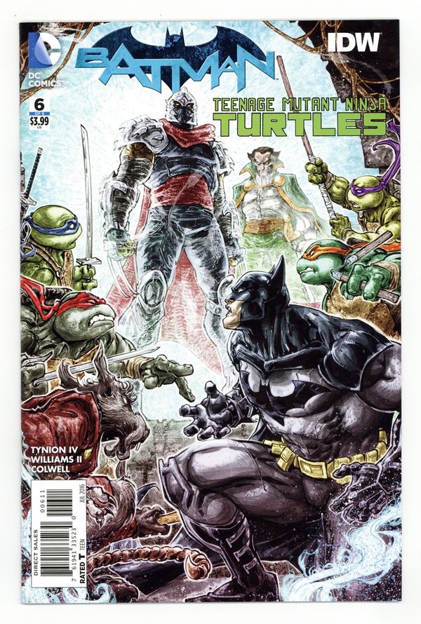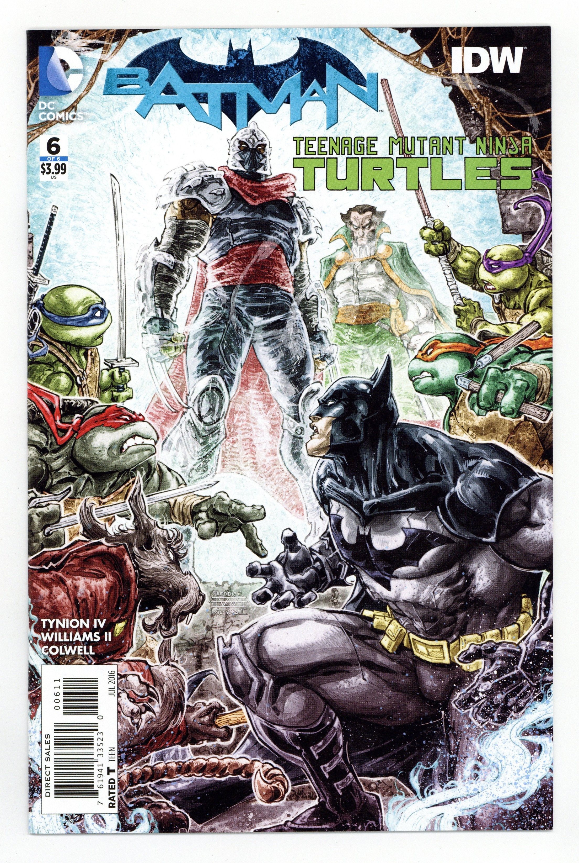 Written by James Tynion IV. Art and Cover by Freddie Williams II. The crossover event of the year comes to its thrilling conclusion. The Turtles have one last, desperate shot at going home. But will they take it, knowing what nefarious plans Shredder has for Gotham City? It's full-on ninja warfare as our heroes go up against the combined forces of the Foot Clan and the League of Assassins. Co-published with IDW. 32 pages, full color. Rated T Cover price $3.99.