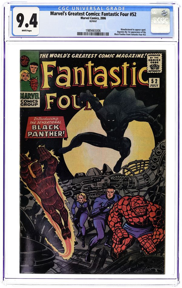 Written by STAN LEE Penciled by JACK KIRBY Cover by JACK KIRBY. Introducing the sensational Black Panther! In time for the wedding of the century comes this cover-to-cover facsimile of T'Challa's first appearance from FANTASTIC FOUR #52 (July 1966)! Scanned by Marvel Comics straight from an archived copy of the original comic, this keepsake edition includes all story pages, ads and text pieces - reproduced exactly as they appeared 40 years ago this month! Cover price $2.99.
