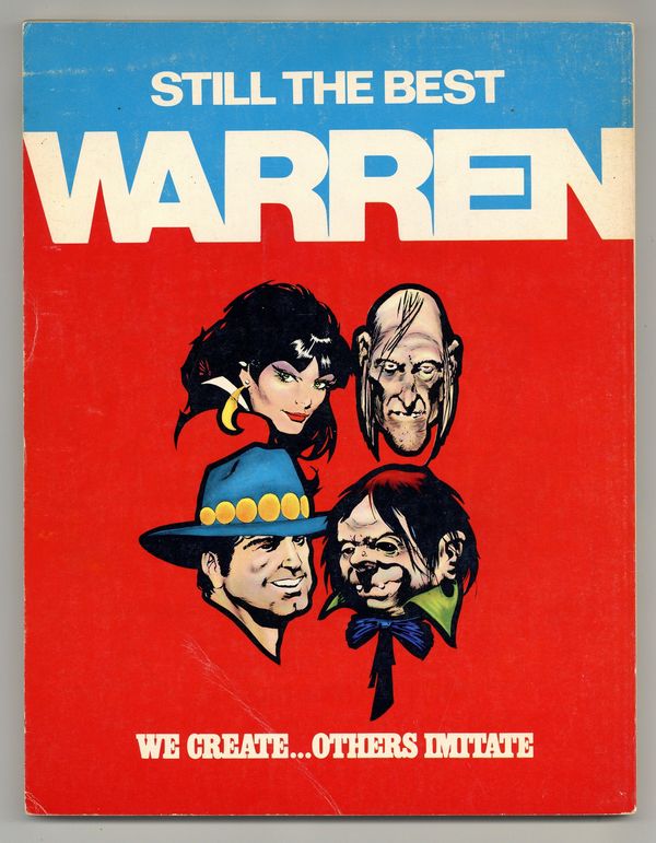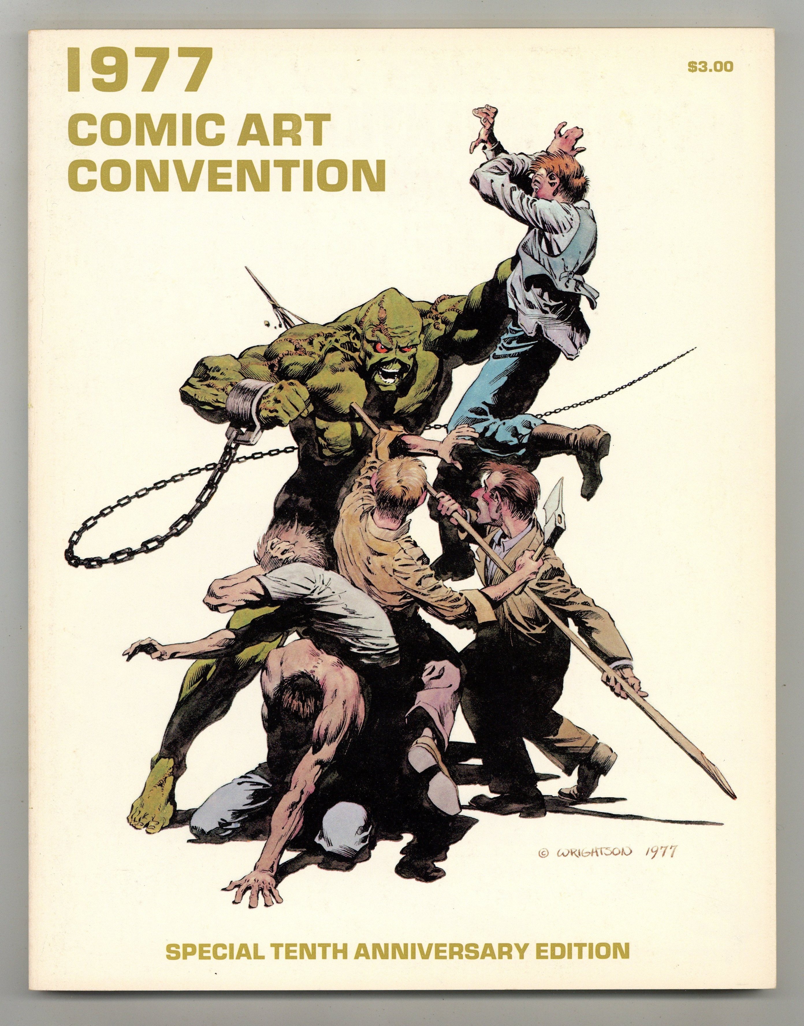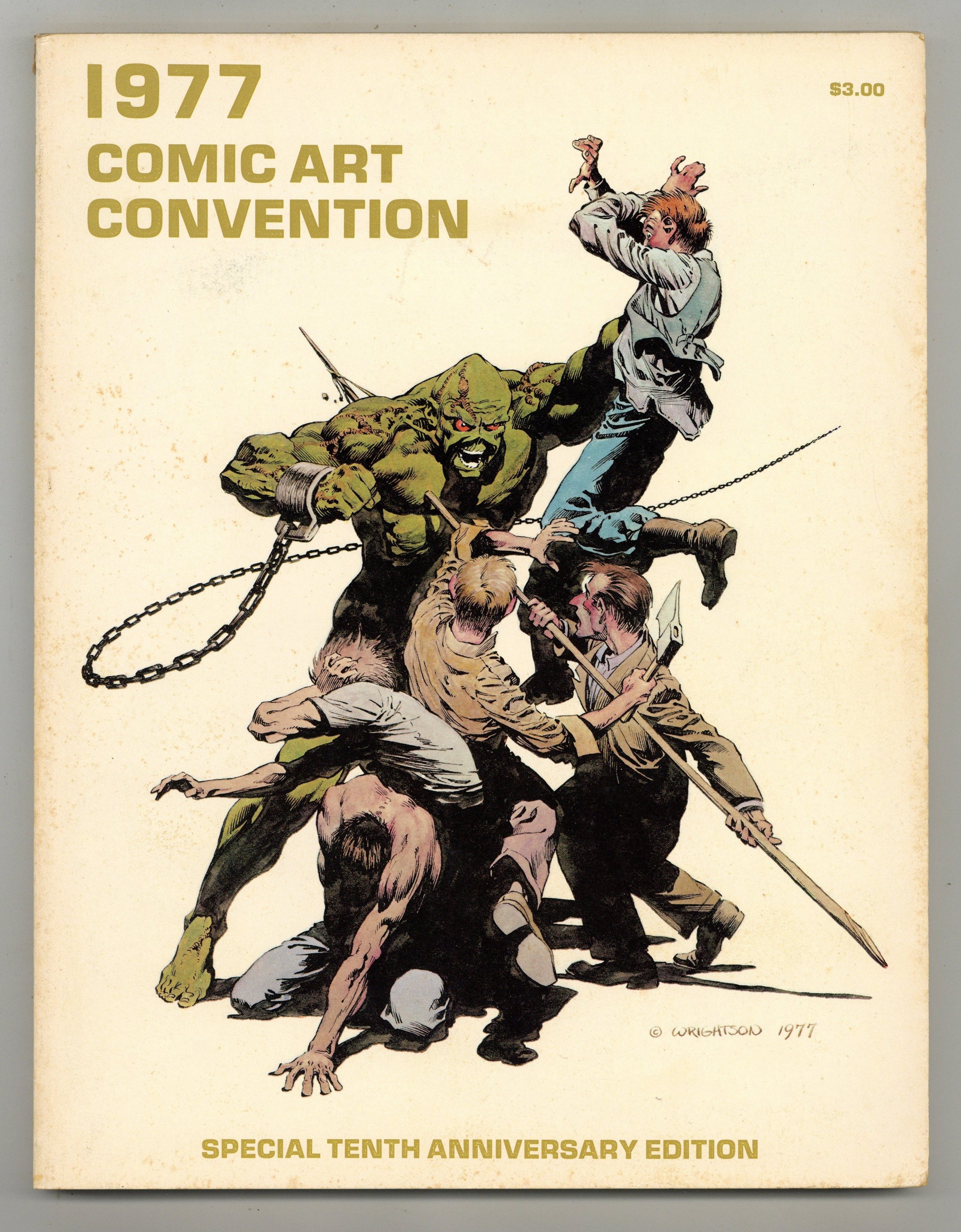Published 1977 by Phil Seuling.$110.00Special Anniversary Edition. Phil Seuling's 10th Annual 1977 Comic Art Convention program includes neat profiles about the artist and talents who draw and write comics. Featured are pin-ups by Steve Ditko, John Buscema, Jack Kirby, Walt Simonson, John Romita, Keith Pollard, Neal Adams, John Romita, Jr., Jack Abel, Alex Toth, Al Milgrom, Gil Kane, and many others. The front cover featrures the Swamp Thing by Berni Wrightson. And, the back cover is a full color full-page ad for Warren. 96 pages, black and white interior, card-stock cover, 8.5-in. x 11-in. Cover price $3.00.