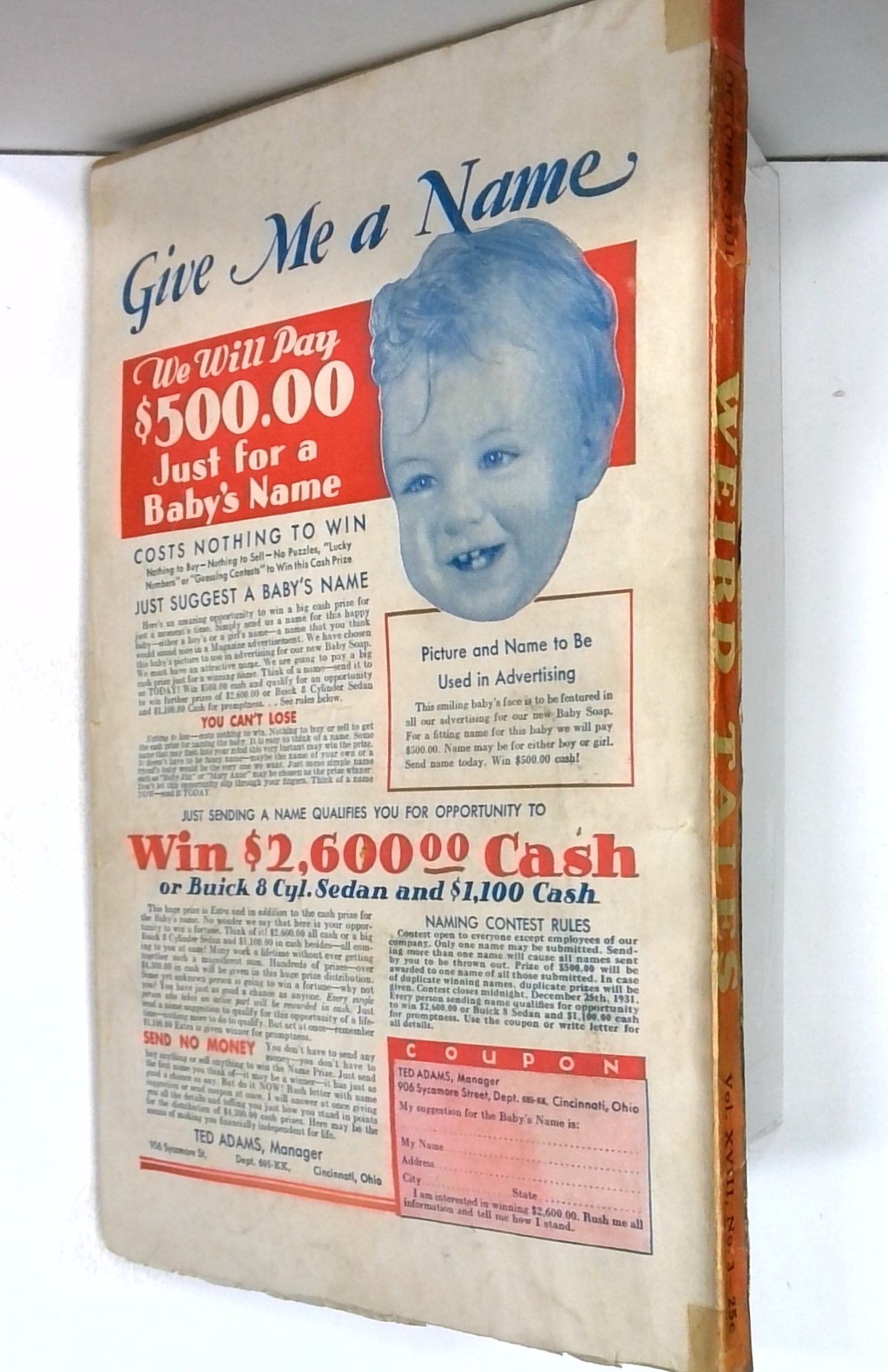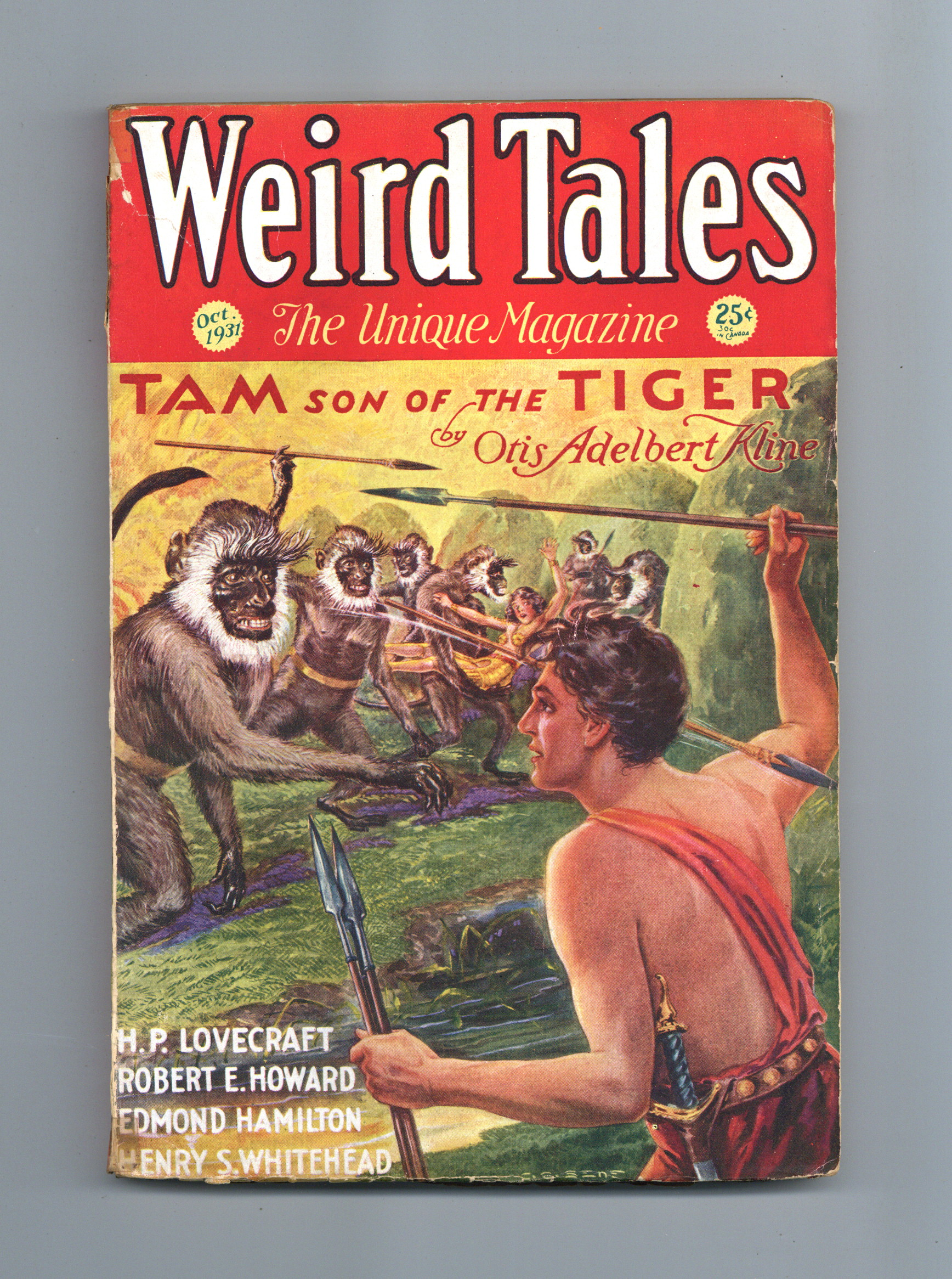 Volume 18, Issue 3 - October 1931. Edited by Farnsworth Wright. Pulp magazine specializing in Horror and Science Fiction stories. This issue features "Tam, Son of the Tiger: Part 4" by Otis Adelbert Kline, plus stories by H.P. Lovecraft, Robert E. Howard, Edmond Hamilton, and Henry S. Whitehead. 6.75-in. x 10-in.; 128 newsprint pages, text (with B&W illustrations). Cover price $0.25.