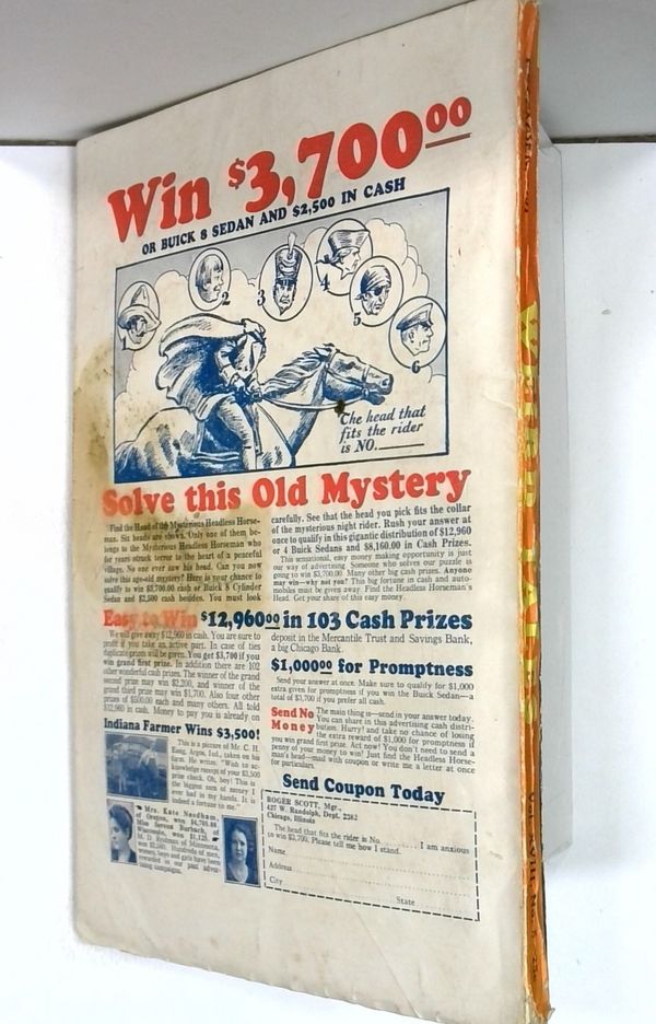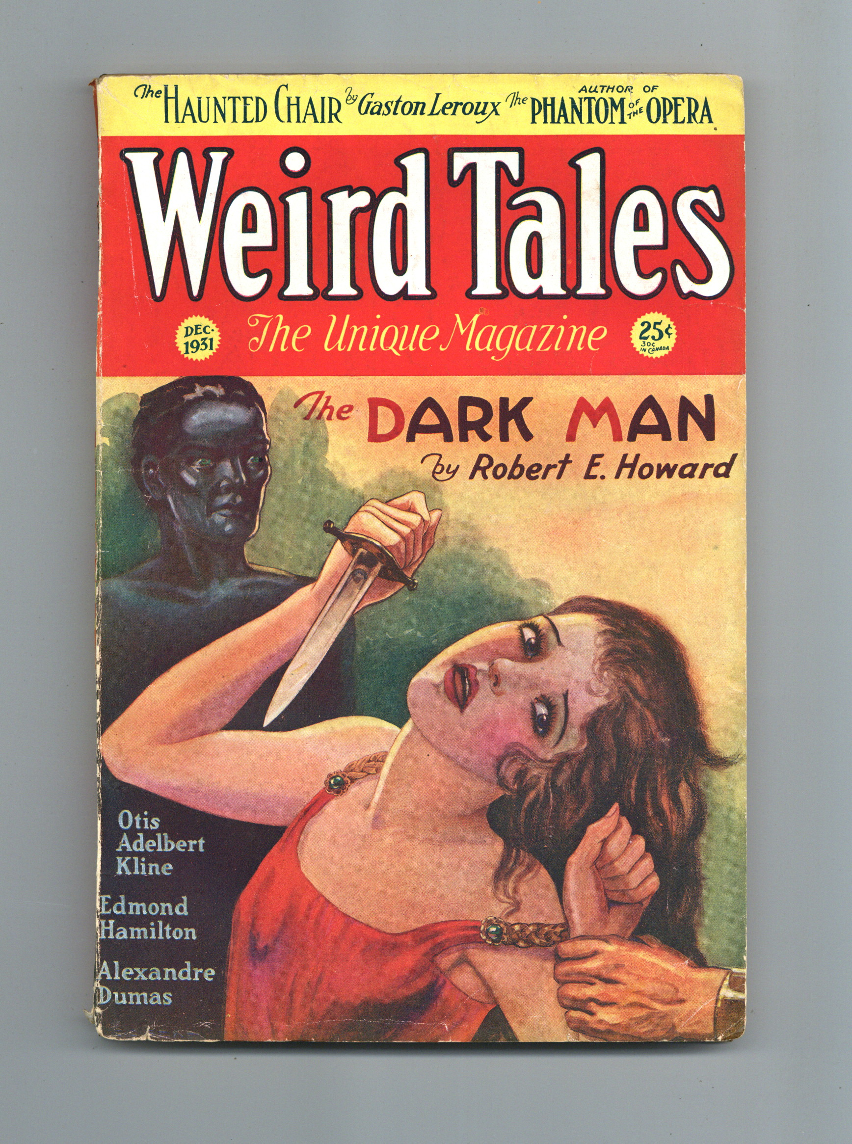 Volume 18, Issue 5 - December 1931. Edited by Farnsworth Wright. Pulp magazine specializing in Horror and Science Fiction stories. This issue features "The Haunted Chair" by Gaston Leroux, "The Dark Man" by Robert E. Howard, and stories by Otis Adelbert Kline, Edmond Hamilton, and Alexandre Dumas. 6.75-in. x 10-in.; 128 newsprint pages, text (with B&W illustrations). Cover price $0.25.