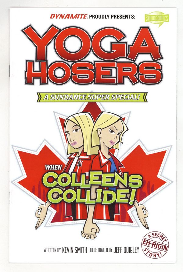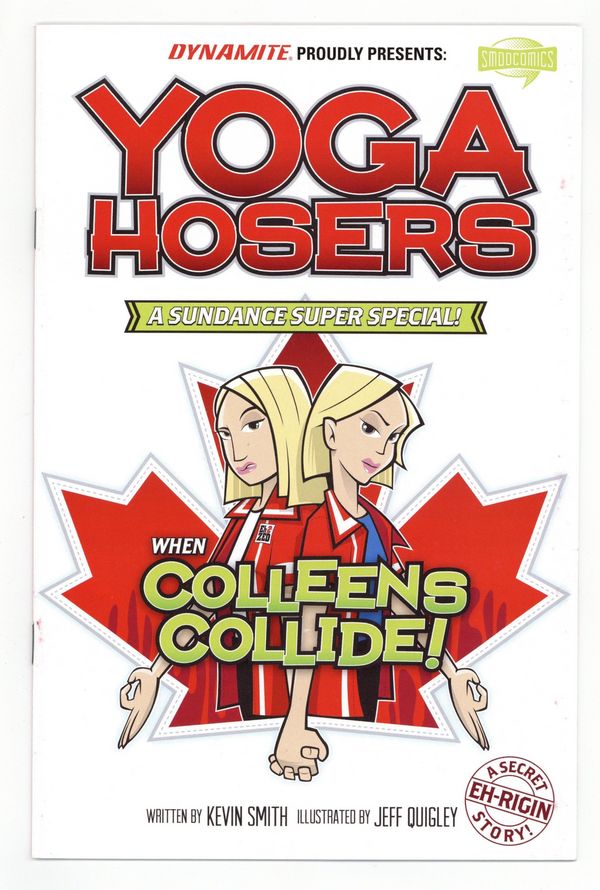 Published 2016 (est.) by Dynamite Entertainment.$16.00Written by Kevin Smith. Art by Jeff Quigley and Liam Quigley. Cover by Jeff Quigley. A red-hot collectible previously only available at the Sundance Film Festival, Smodcomics proudly presents the official prequel to Kevin Smith's Yoga Hosers, starring Johnny Depp, Harley Quinn Smith, and Lily-Rose Depp! Since the remarkably charismatic duo of Colleen C. and Colleen M. debuted in the horror-comedy film Tusk, fans have been clamoring for more of these 15-year-old yoga nuts... and with Yoga Hosers: A Sundance Super Special, True North Trilogy devotees will finally see the continuation of their story! What is the secret 'eh-rigin' of these convenience store clerks destined to face the monsters of Manitoba? How did fate bring two Colleens together to survive all the craziness that Winnipeg could throw at them? And can they harness Moksha, the ultimate goal of yoga, to destroy everything that threatens the things they love, eh? 20 pages, full color. Cover price $10.00.