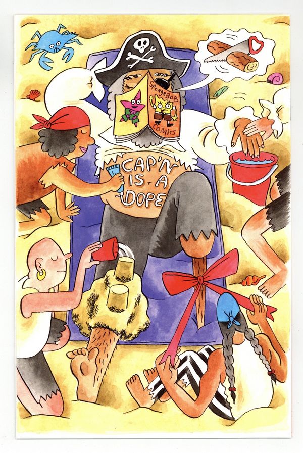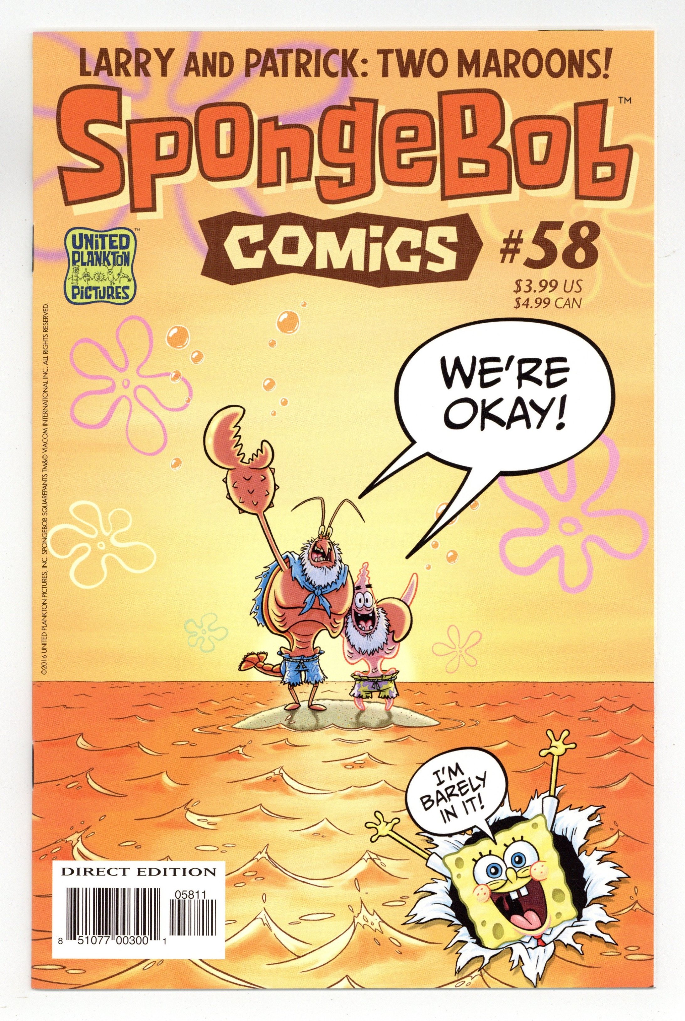 Published Jun 2016 by United Plankton Pictures.$36.00Written by Jay Lender and Corey Barba. Art by Jacob Chabot and Gregg Schigiel. Cover by Jacob Chabot. Patrick and Larry the Lobster are the 'Crusoem Twosome' in a 23-page SpongeBob epic with only a little bit of SpongeBob! When Patrick's allergies cause him and Larry to be marooned far from Bikini Bottom, it's all Larry can do to keep his buff composure and rock-hard cool! Will sea monsters, tidal waves, and a distressing lack of free weights prove deadlier than being stuck 24-7 with Patrick? Plus, SpongeBob catches a magic jellyfish; Gary loses his bowl, a new 'SpongeFunnies' from James Kochalka; and more ocean facts from Maris Wicks! 32 pages, full color. Cover price $3.99.