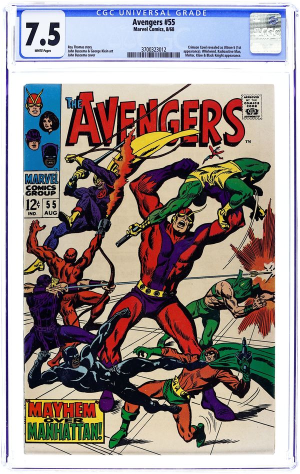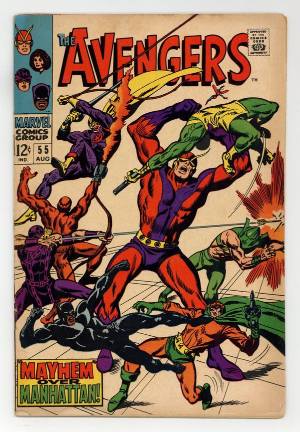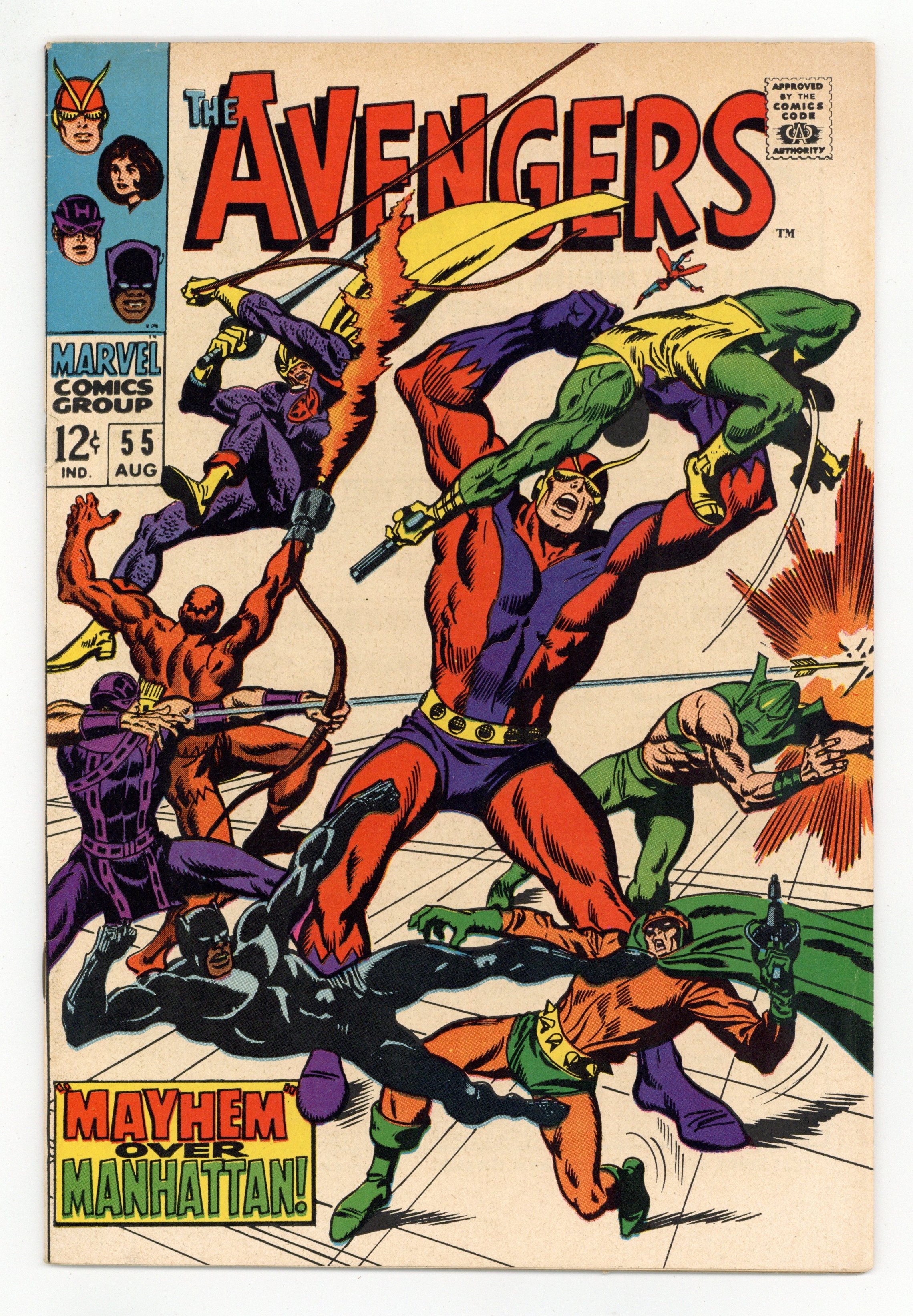 First (full) appearance of Ultron in "Mayhem over Manhattan!" Part 2 of 2. Guest-starring the Black Knight. Script by Roy Thomas. Pencils by John Buscema. Inks by George Klein. Cover by John Buscema and George Roussos. One of the legendary issues of the Avengers! As Earth's Mightiest Heroes battle their greatest foe for the first time! But at this point, they don't know who or what Ultron-5 is! The four avengers are still reeling from Jarvis' betrayal, the Masters of Evil's victory, and the Crimson Cowl's identity! However Ultron doesn't care about the Avengers' confusion! Because he's just loaded them inside a hydrogen bomb... and set the bomb on a collision course with the Empire State Building! Oh my, this looks like curtains for Earth's Mightiest! Unless the resourceful Black Knight and remorseful Edwin Jarvis can think of something quick! Appearances by Aragorn, Klaw, Melter, Whirlwind, and the Radioactive Man. Avengers Lineup: Black Panther, Goliath, Hawkeye, and the Wasp. (Notes: Ultron returns in Avengers #57. This issue was reprinted in Marvel Super Action #14. This two-part story was reprinted in 1993 in the trade paperback: The Greatest Battles of the Avengers.) 36 pages. Cover price $0.12.