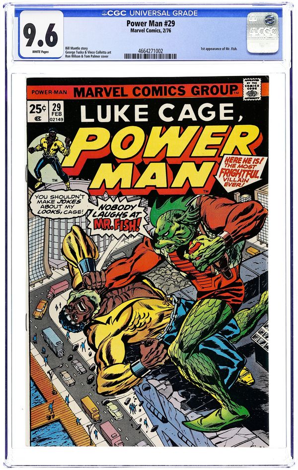 Fill-in issue. "No One Laughs at Mr. Fish!" Script by Bill Mantlo, pencils by George Tuska, inks by Vince Colletta. Luke Cage face the amphibian menace of the man called Mr. Fish. And you better believe that no one laughs at his name twice. NOTE: As a result of deadline issues, the story that began in # 28 continues in # 30. The letters page includes Marvel Value Stamp series B # 25 (Captain America by Jack Kirby). Spider-Man stars in a one-page Hostess ad, "The Kidnap Caper." Tom Palmer cover inks. Cover price $0.25.