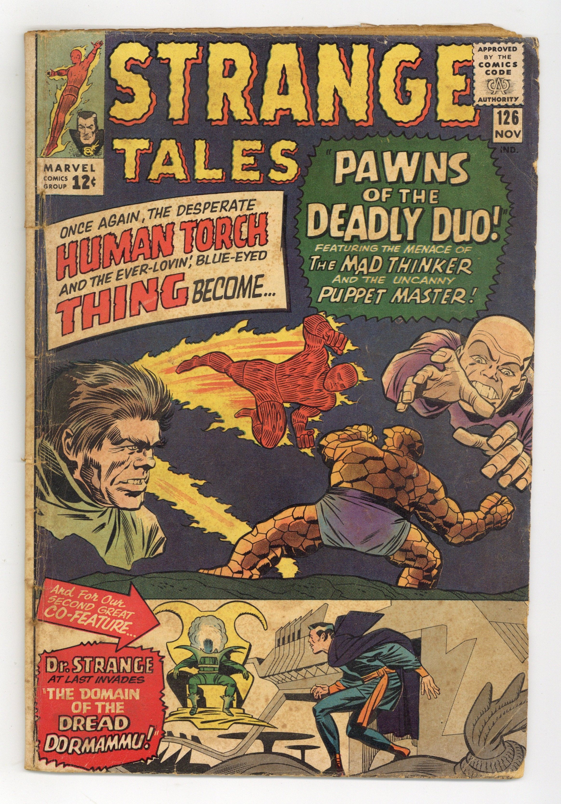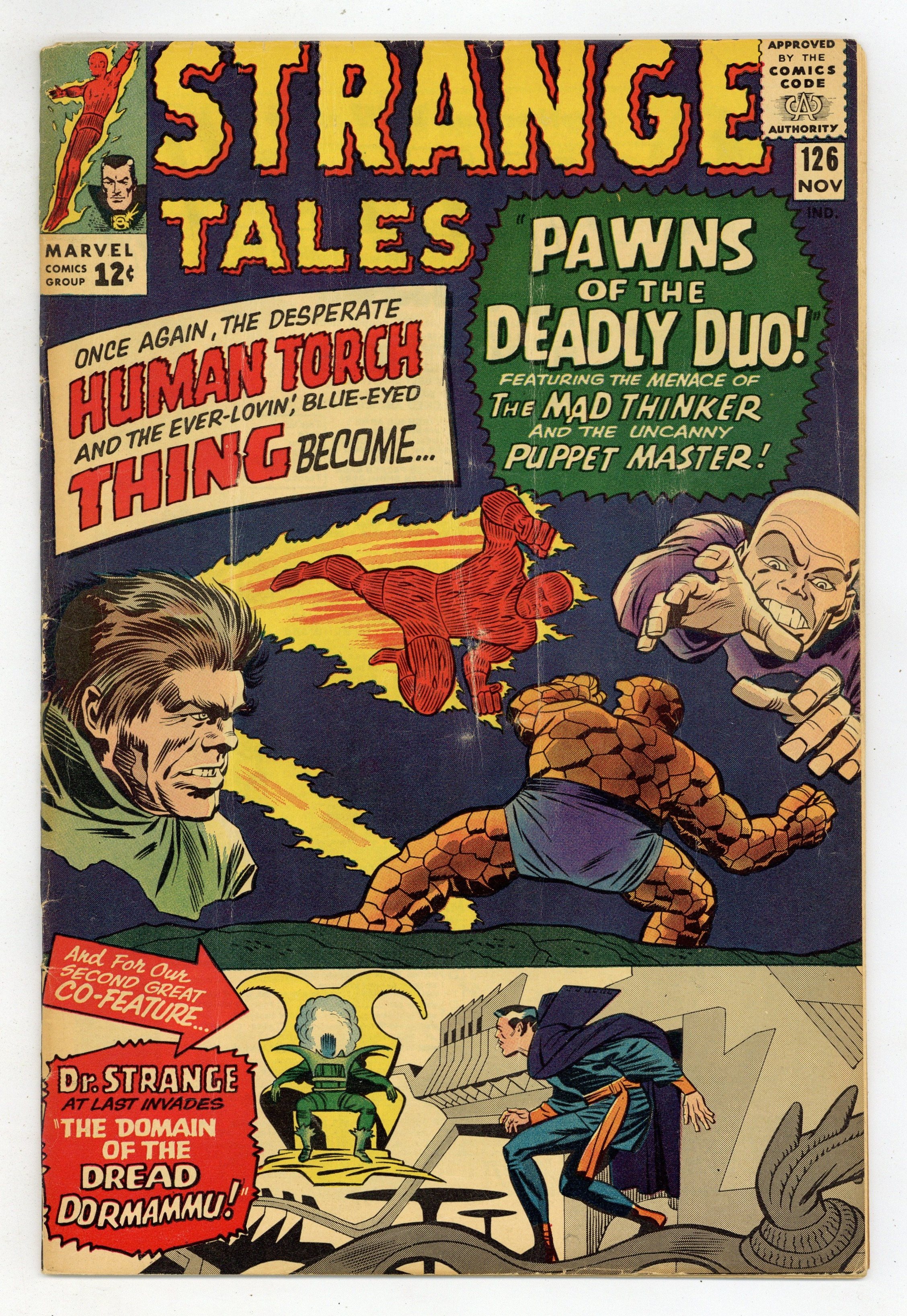 Starts Jan 26 First appearance of Dormammu and Clea (named in issue 146). The Human Torch and the Thing face the Thinker and the Puppet Master in "Pawns of the Deadly Duo!" Script by Stan Lee, pencils by Dick Ayers, inks by Paul Reinman. Reed Richards and Sue Storm appearances. Doctor Strange stars in "The Domain of the Dread Dormammu!" Script by Lee, art by Steve Ditko. First letters page. Jack Kirby/Chic Stone cover. 36 pgs. Cover price $0.12.