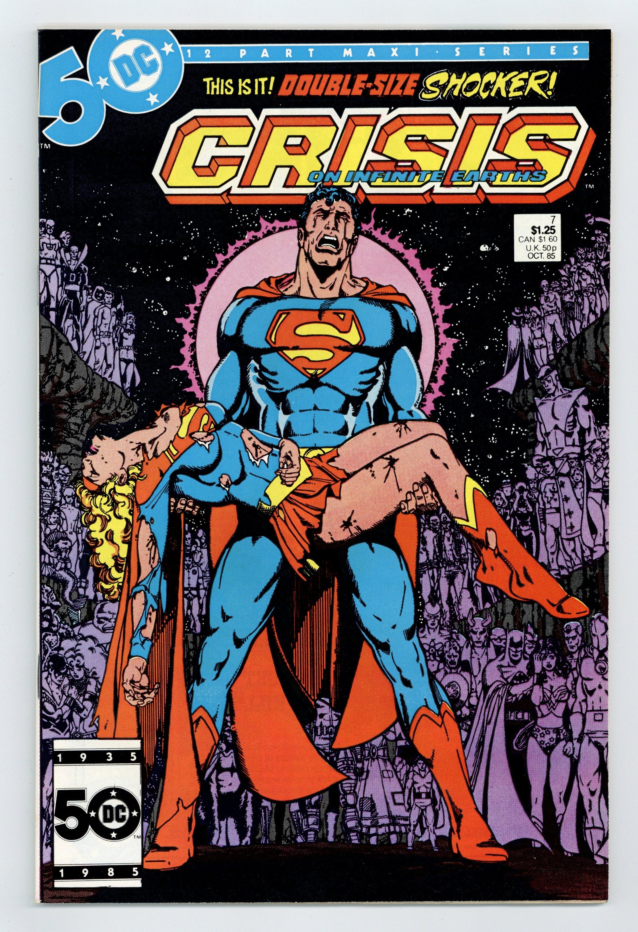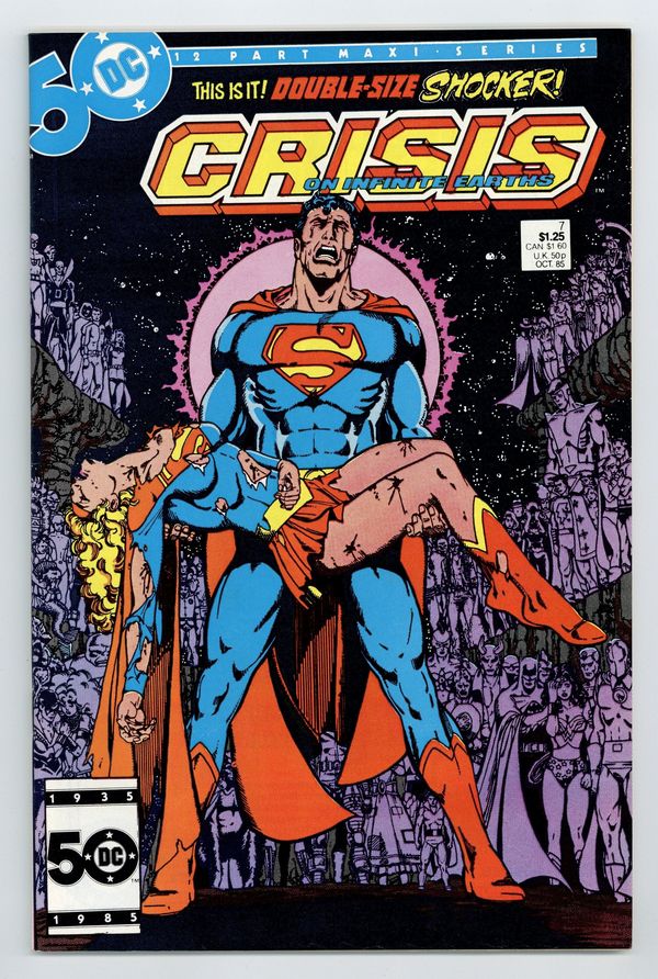 Starts Jul 4 Direct Edition. "Beyond the Silent Night!" Written by Marv Wolfman. Art by George Perez, Dick Giordano, and Jerry Ordway. At last the origins of the most mysterious players in this story are revealed. Learn the secret pasts of Pariah, and why he is destined to witness world after world die, the tragic past of Harbinger, the mysterious Monitor, and evil incarnate, the Anti-Monitor. Plus, in order to stop the Anti-Monitor from destroying the last remaining Earths in the multiverse, a cadre of the DCU's most powerful heroes mount an all out assault on the villain's stronghold in the dangerous Anti-Matter Universe. It is a task not everyone will survive. Featuring the heroic and tragic death of Supergirl. Cover price $1.25.