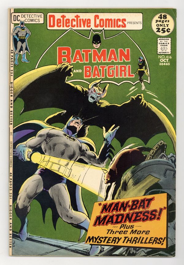 52-page giant issue. Cover art by Neal Adams. "Man-Bat Madness!", script and art by Frank Robbins; A series of chance occurrences leads Kirk Langstrom to relapse into his Man-Bat identity after marrying Francine Lee, and the Batman must capture him and restore him to normalcy. "The Deadly Go-Between!", script by Frank Robbins, art by Don Heck; Commissioner Gordon's friend, officer Jim McClean, has been murdered, and the Commissioner has vowed to catch his friend's killer; This prompts Barbara Gordon to do her own investigation as Batgirl. "Rex - Circus Detective!", script by Bob Kanigher, pencils by Alex Toth, inks by Sy Barry, reprinted from The Adventures of Rex the Wonder Dog #3. "The Case of the Gold Dust Death!", art by Ramona Fradon, originally printed in Gang Busters #30. Letter from author/artist Frank Robbins, who explains that the inspiration for the Man-Bat story came from fan Anthony Kowalik. 52 pgs., full color. $0.25. Cover price $0.25.